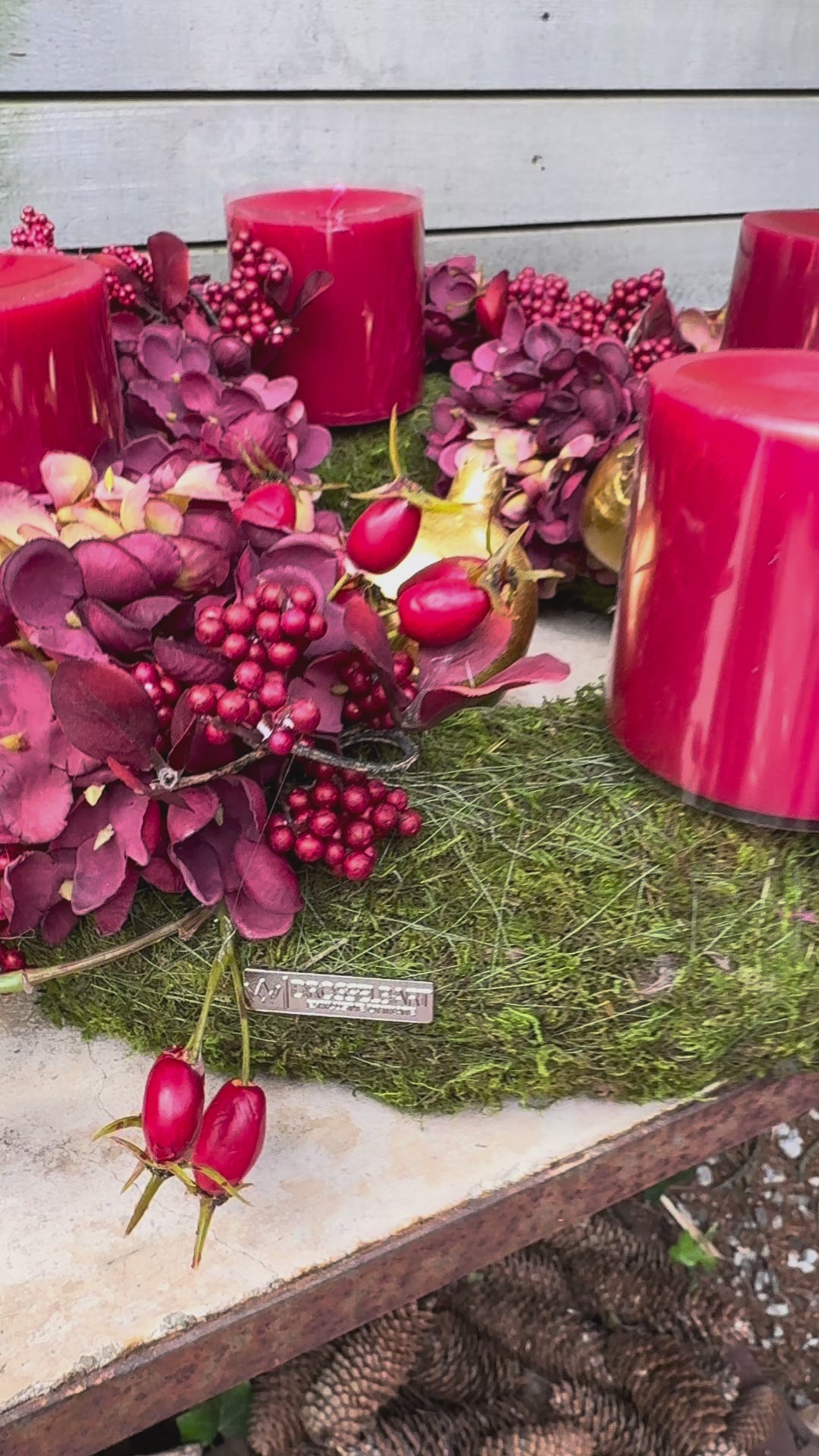 • Der abgebildete Kranz - Grundlage ist ein Mooskranz mit Faux Blüten in der Farbe dunkelrot