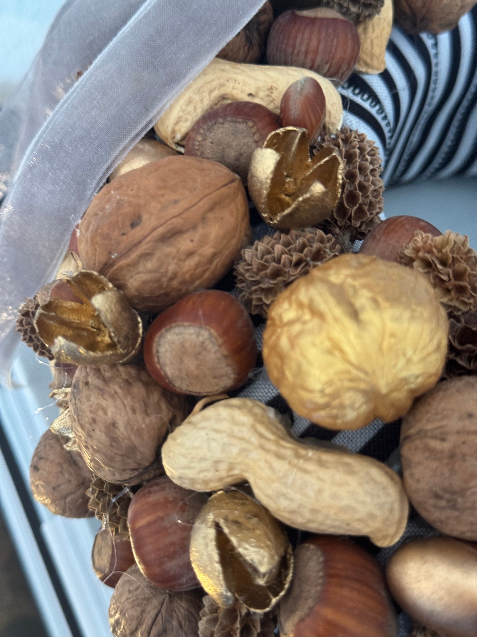 Da wird die Vorweihnachtszeit zur kleinen Märchenstunde. Ein echtes Statement-Piece sorgfältig von Hand gefertigt, vereint er echte Hasel; Wal; und Erdnüsse mit goldenen Akzenten zu einem kunstvollen Kranz - wie aus dem Zauberwald !