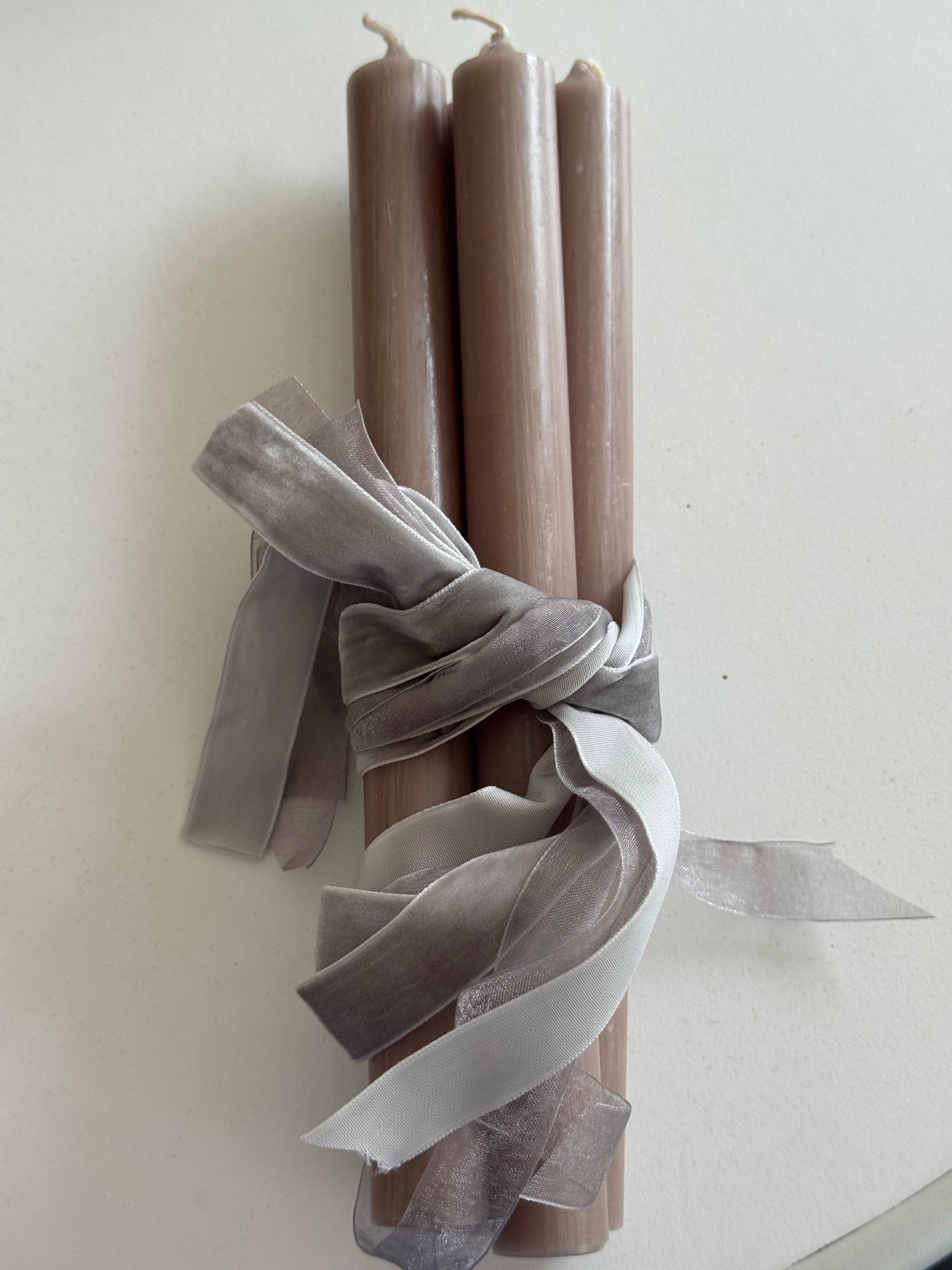 • Inklusive 4 Stabkerzen H: 24 cm Farbe: sanftes, samtiges Kiesel/Taupe mit Schleifen