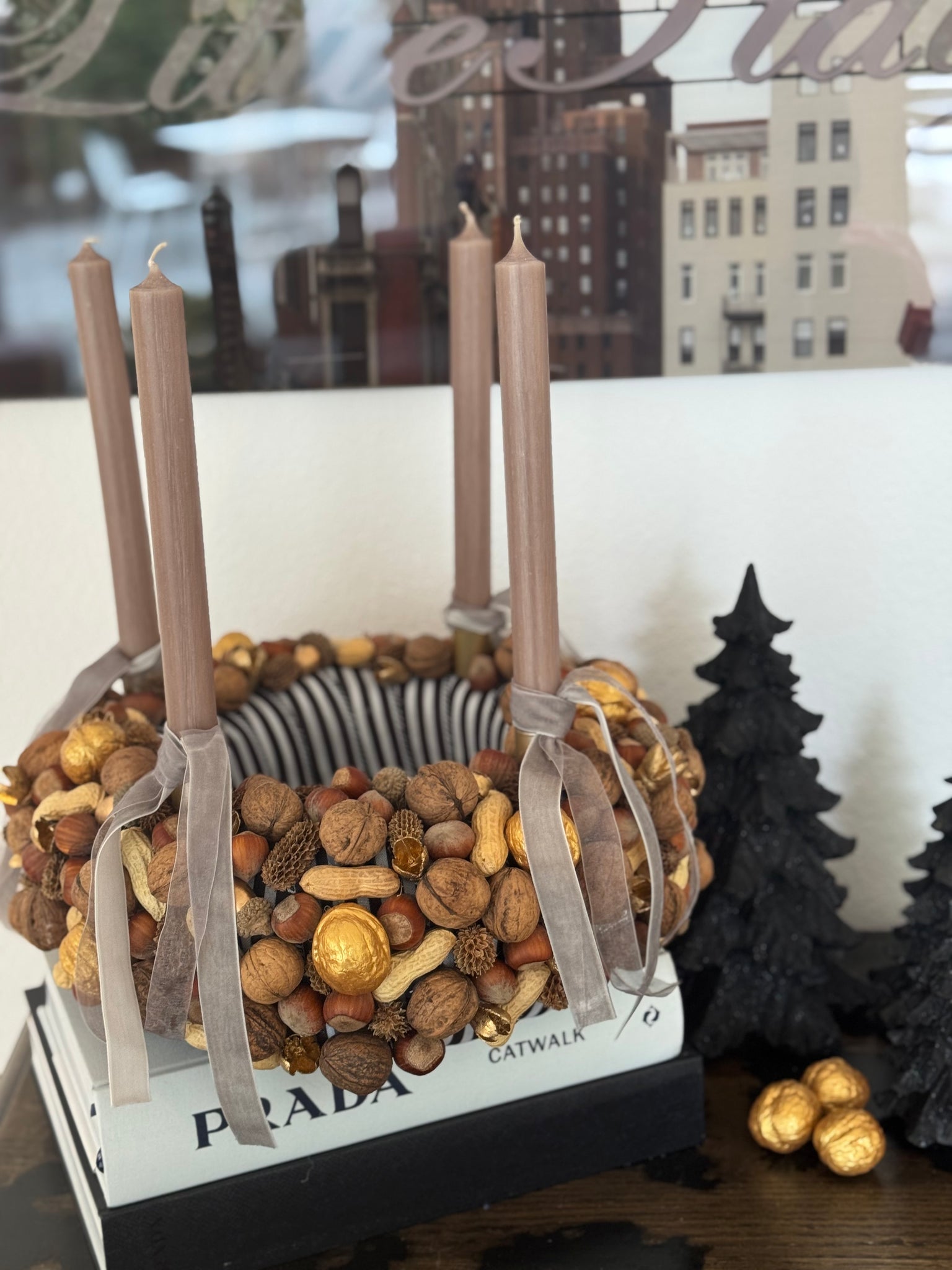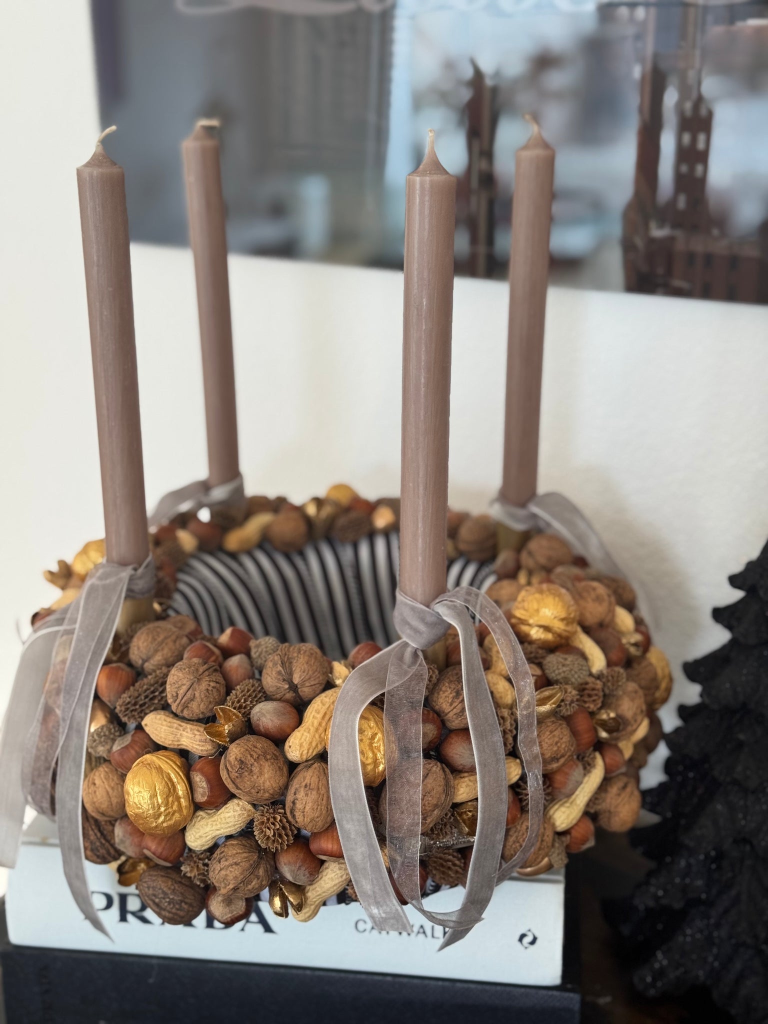 • Ein Adventskranz aus Nüssen, und goldenen Akzenten (goldenen, echten Walnüsse, Haselnüssen, Erdnüssen und echter, goldener Bakuli (Fruchtschale eine indischen Baumes) - wie abgebildet