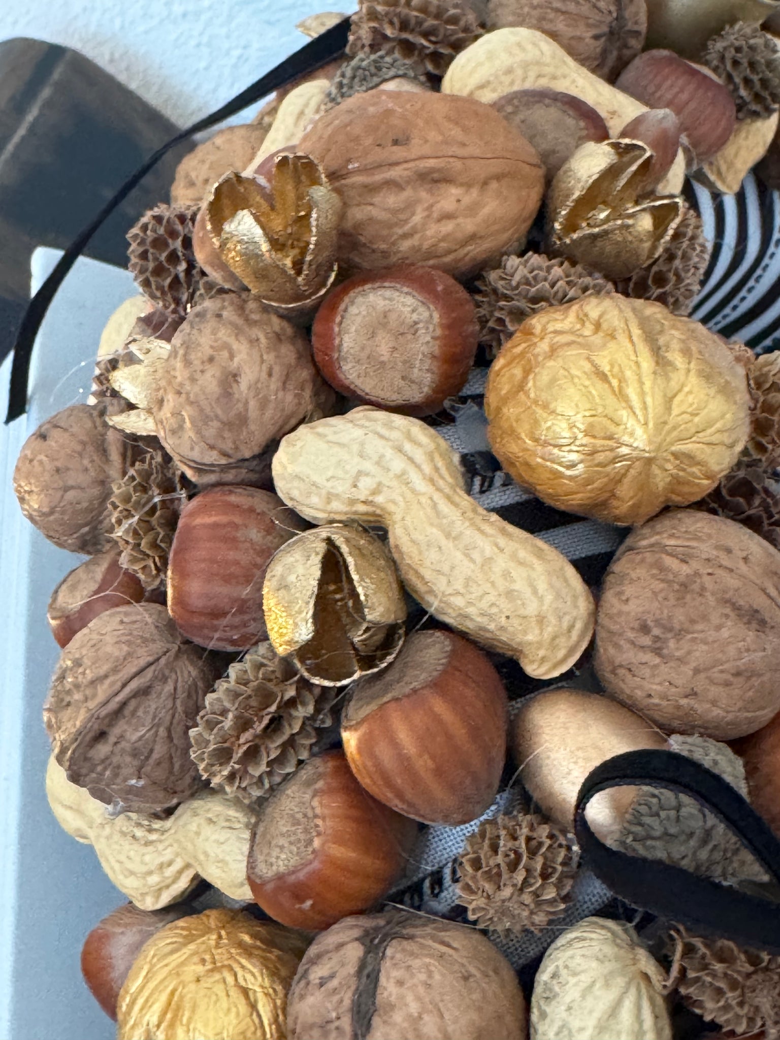- Ein Adventskranz aus Nüssen, und goldenen Akzenten (goldenen, echten Walnüsse, Haselnüsse, Erdnüssen und goldener Bakuli (Fruchtschale eine indischen Baumes) - wie abgebildet