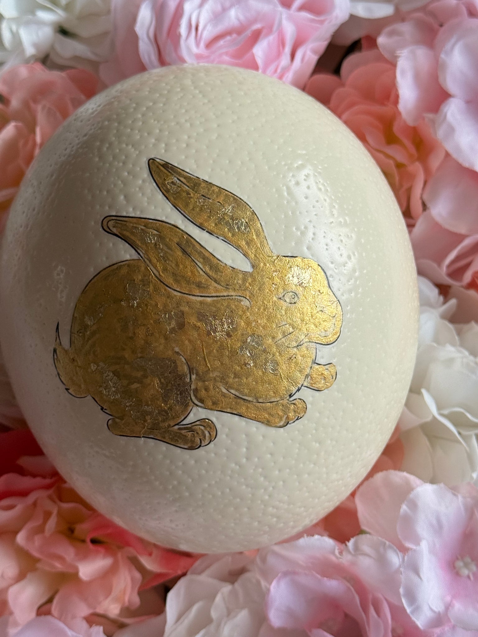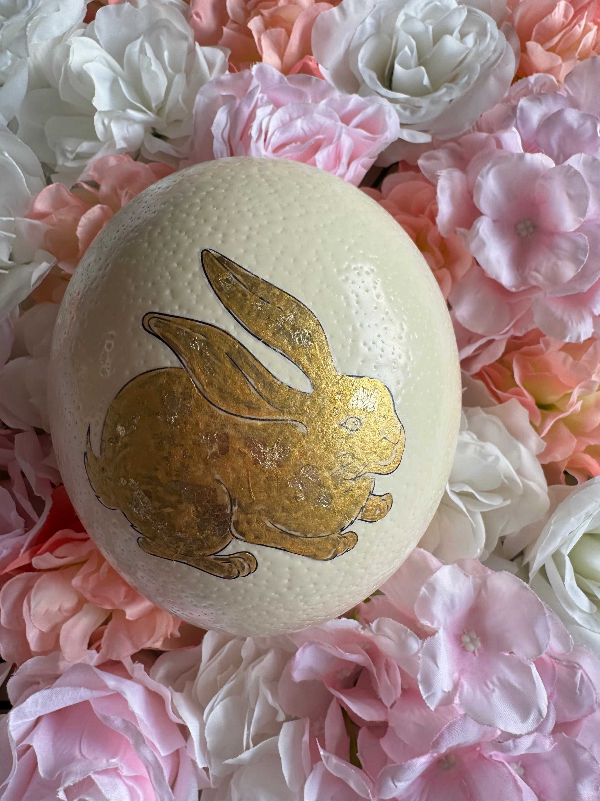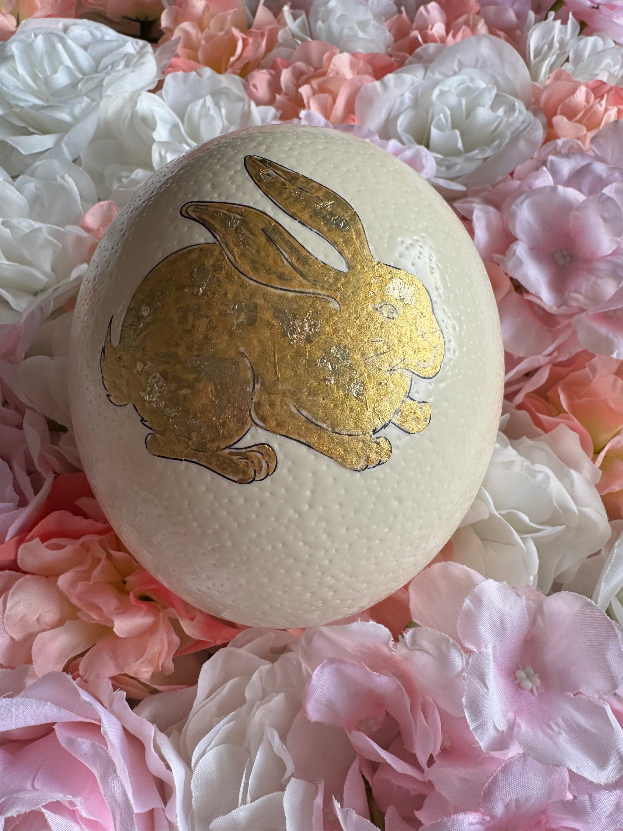 Die Liebe zum Feldhasen verleiht dem Straußenei eine starke, inspirierende Ausstrahlung. Der Feldhase edel, zeitlos in gold abgebildet.
