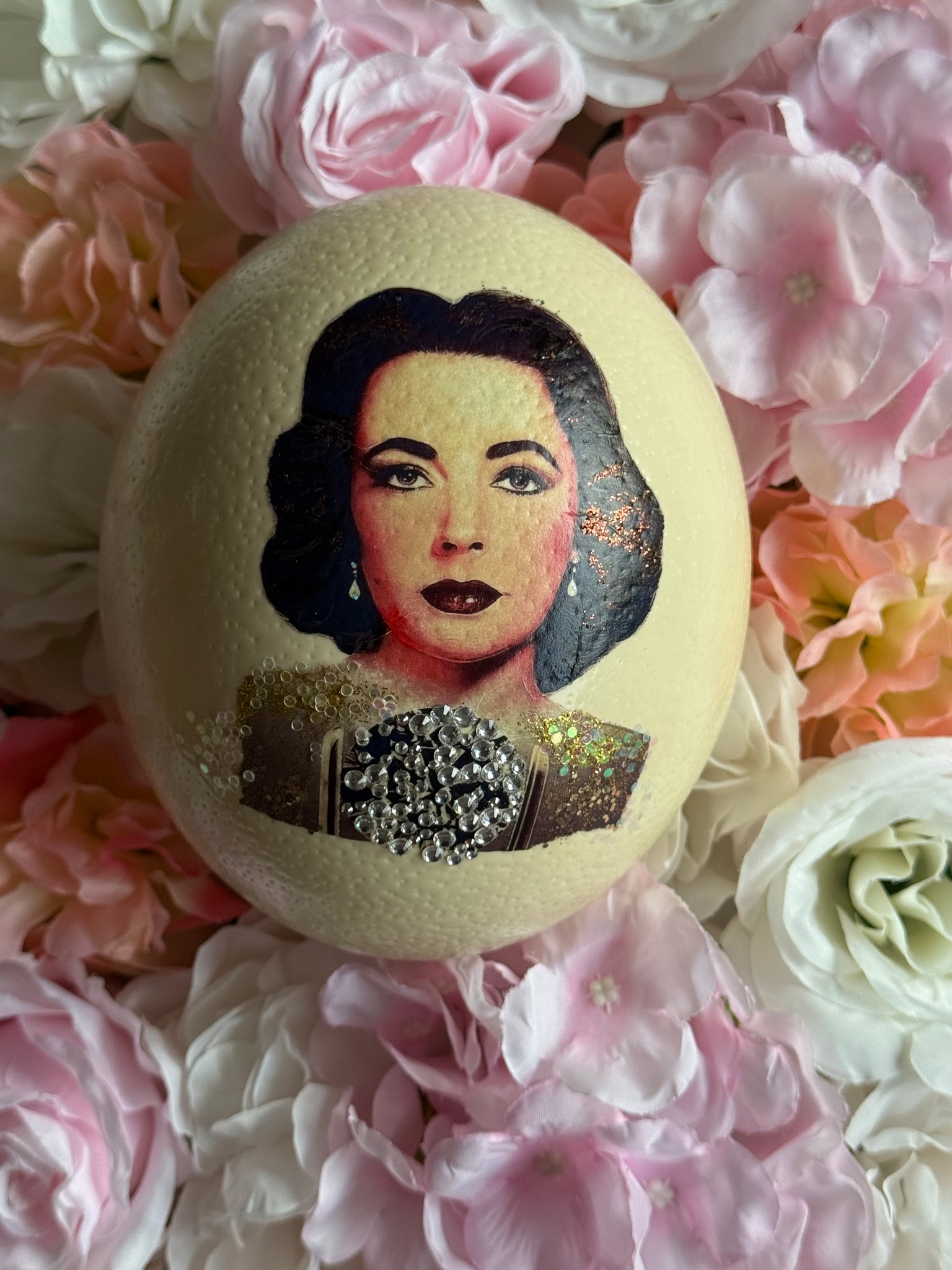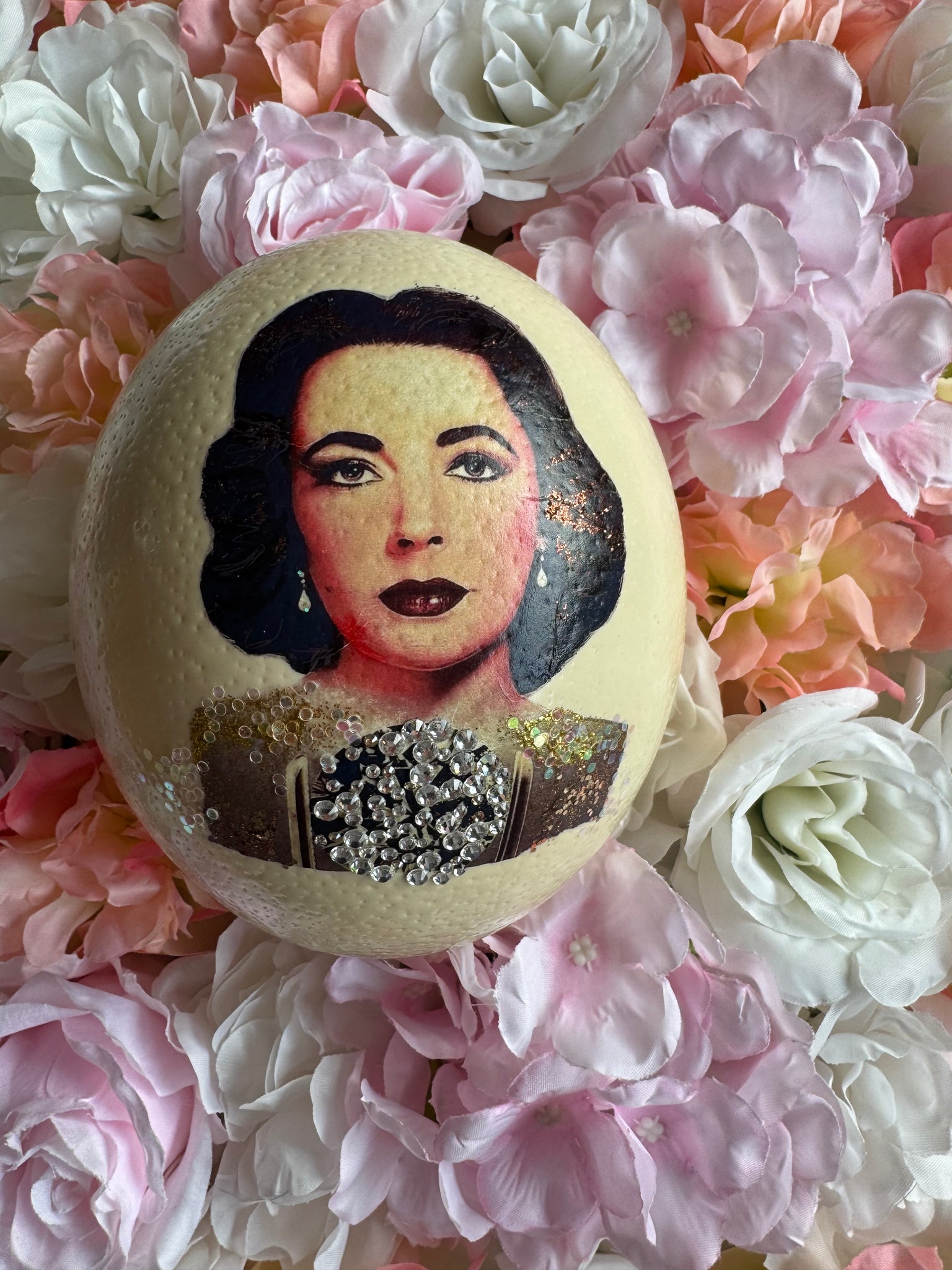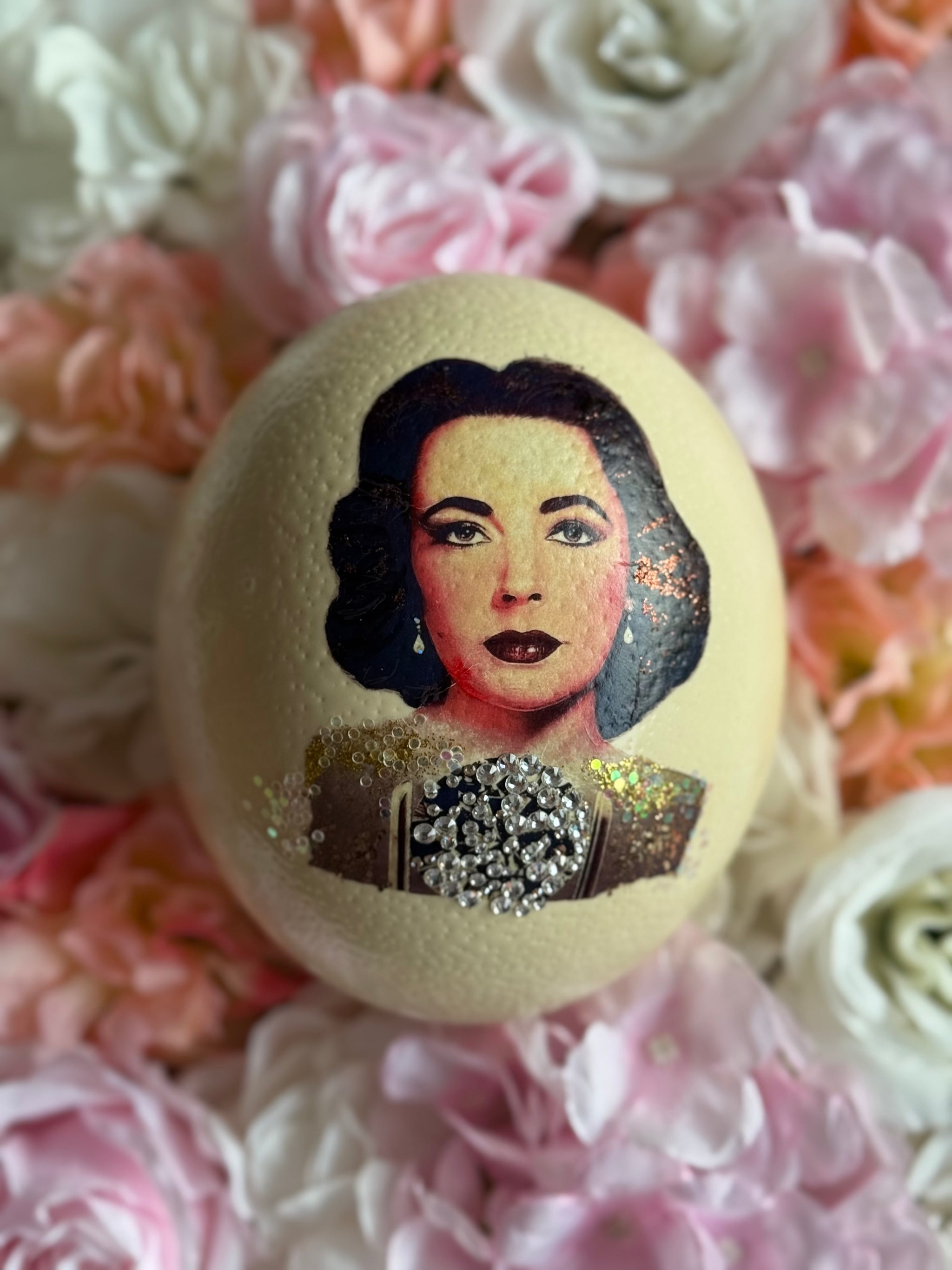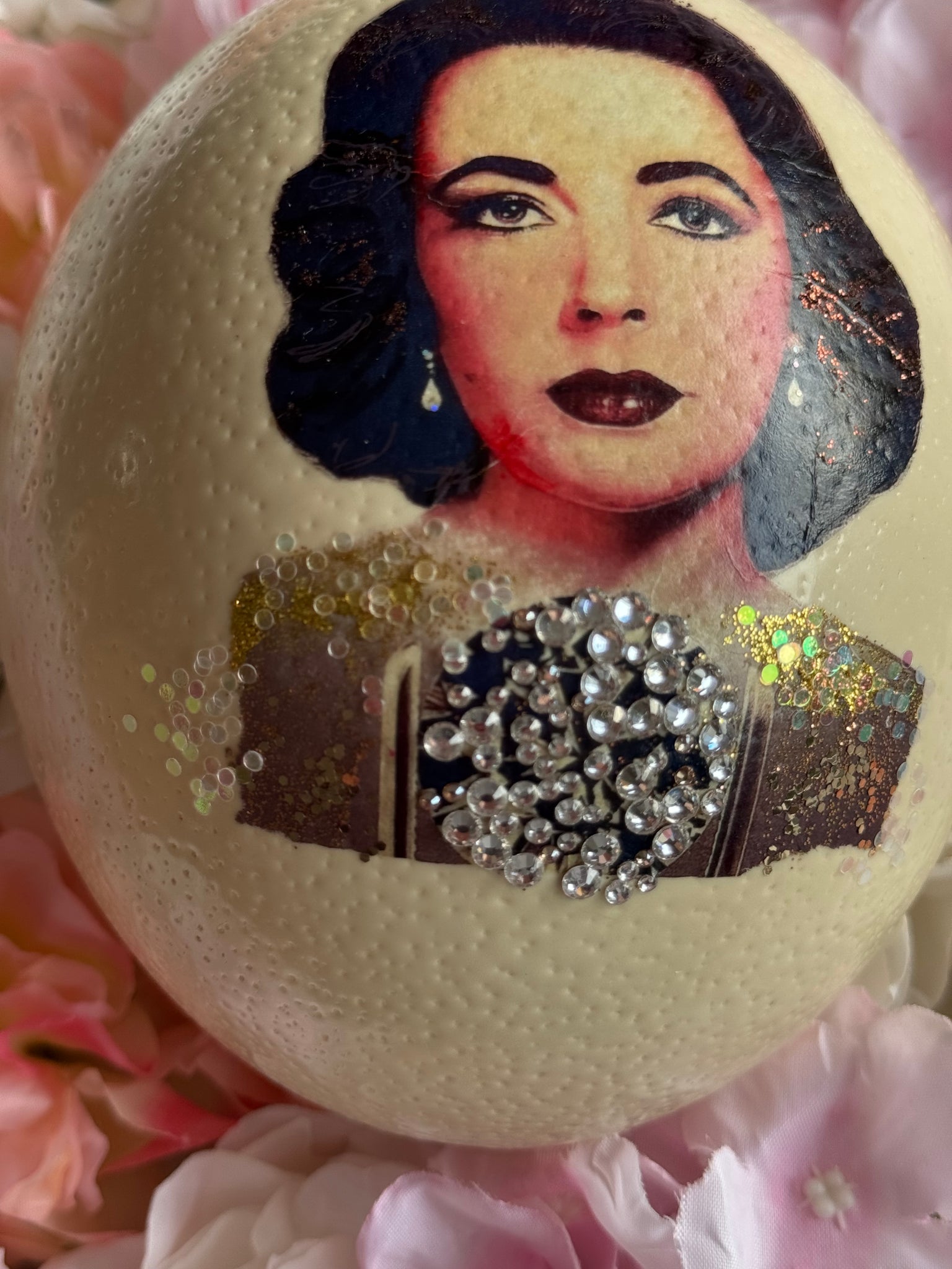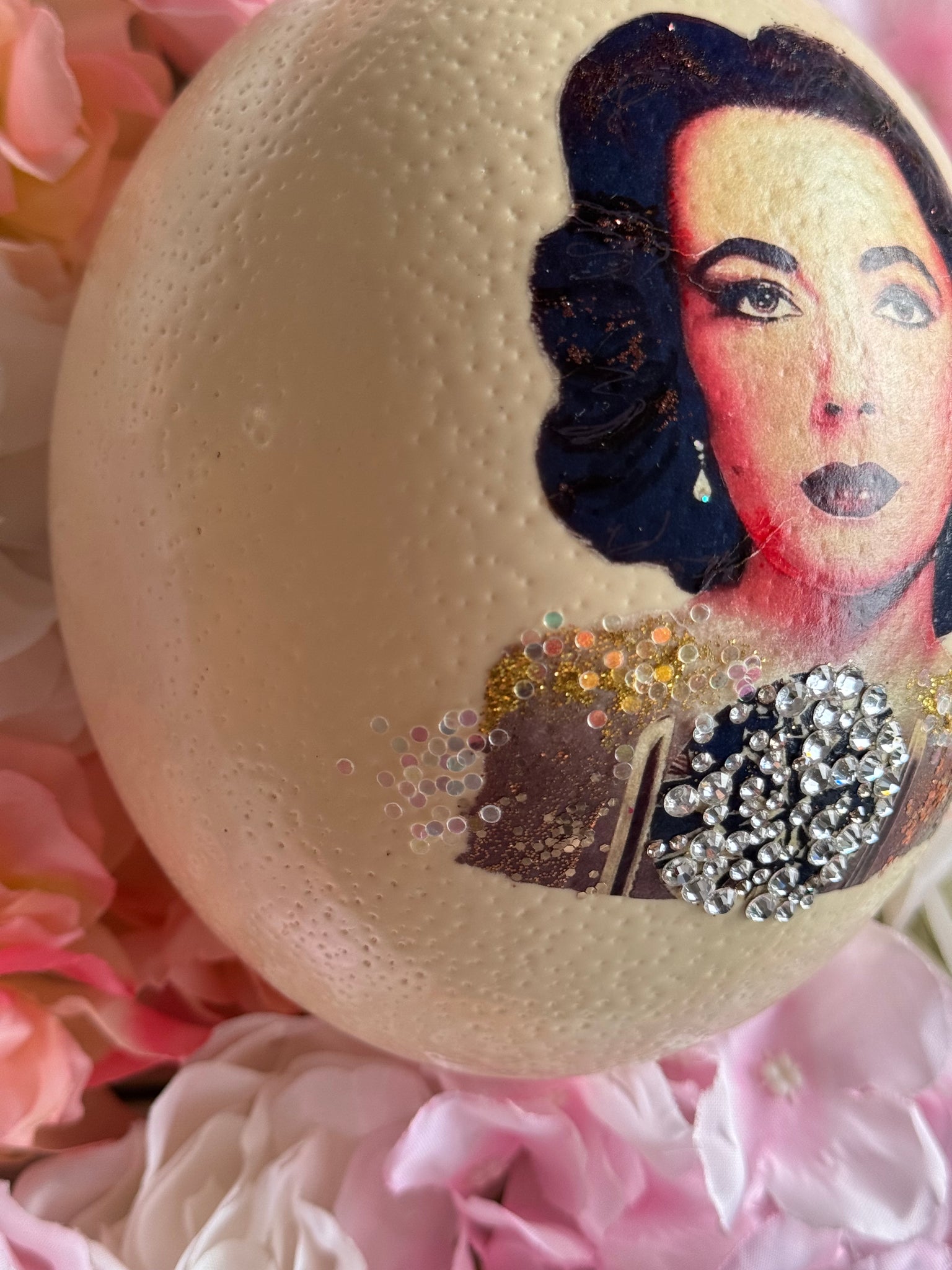 Die Liebe zu Liz Taylor verleiht dem Straußenei eine starke, inspirierende Ausstrahlung. Die Vorderseite ist mit Glitzer besetzt, die das Design stilvoll akzentuieren und dem Ei eine luxuriöse, lebendige Tiefe verleihen. Farblich harmonisch und mit großer Sorgfalt arrangiert, wird jedes Detail zum Blickfang.