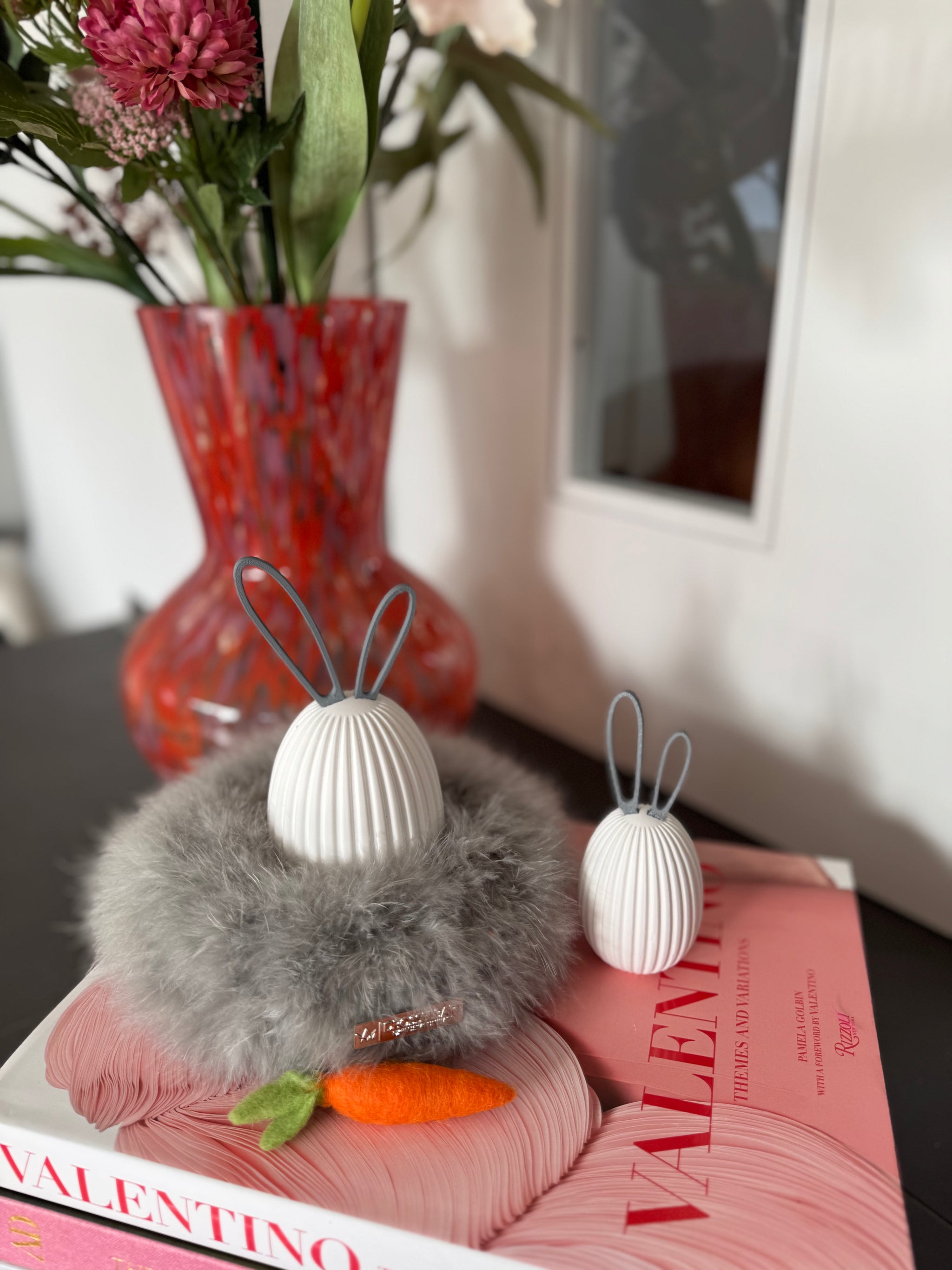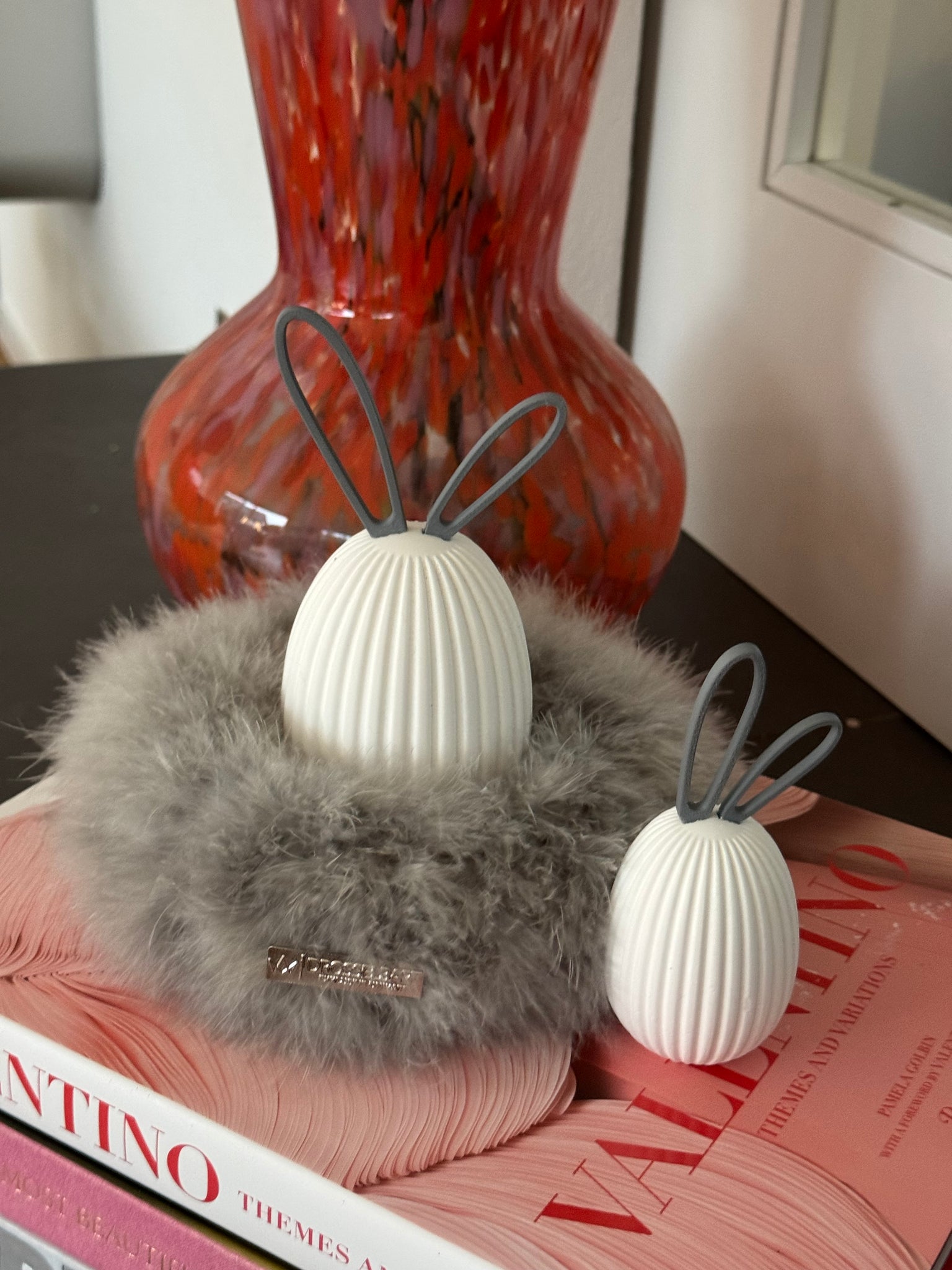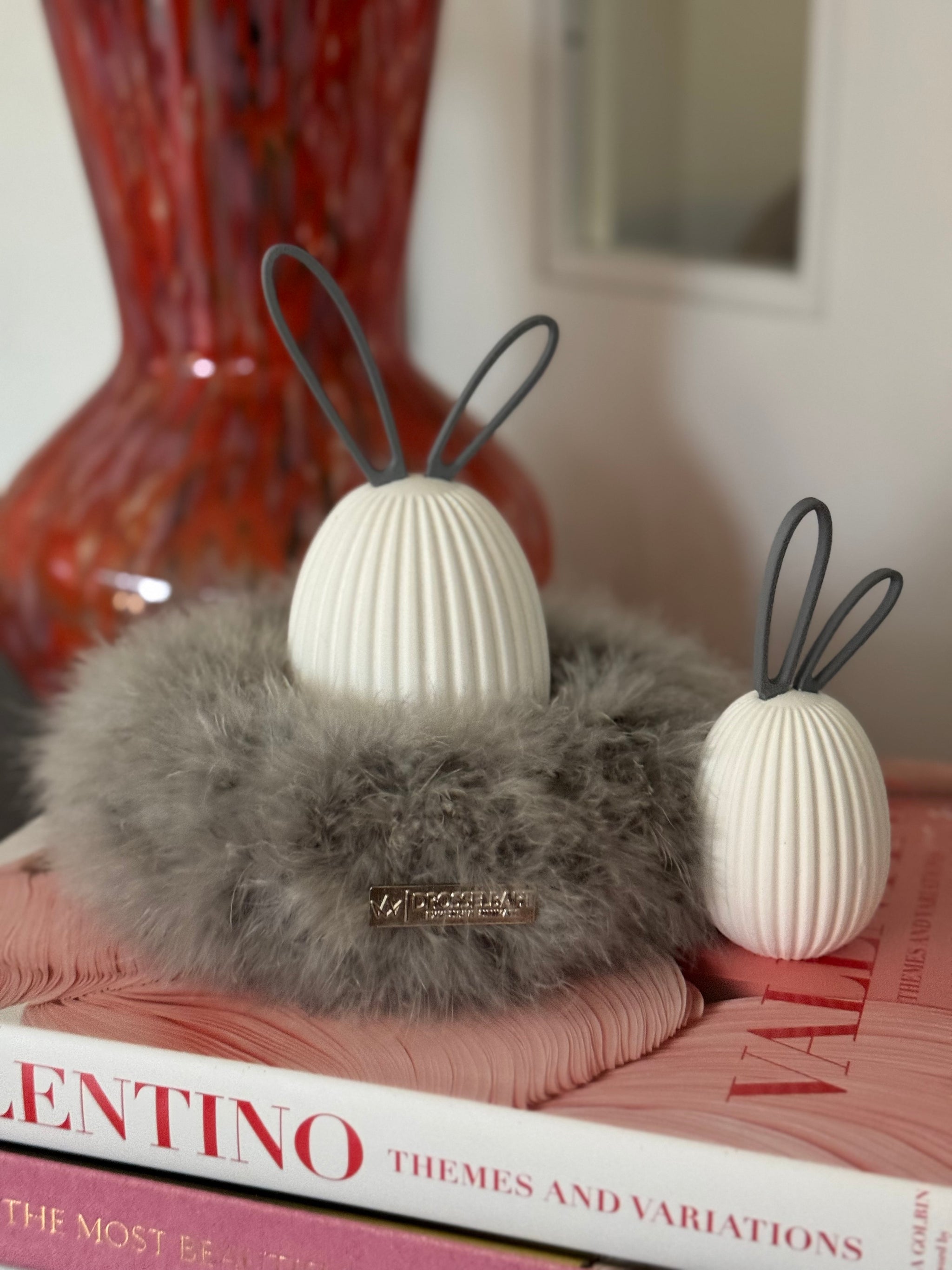 Das Set besteht aus zwei geriffelten Ostereiern aus Keramik in unterschiedlichen Größen, die harmonisch auf einem weichen Marabufederkranz von Drosselbart Design arrangiert sind. Die farblich abgestimmten Ohren werden ganz einfach in die dafür vorgesehene Öffnung gesteckt und sorgen für einen klaren, minimalistischen Look mit humorvollem Detail.