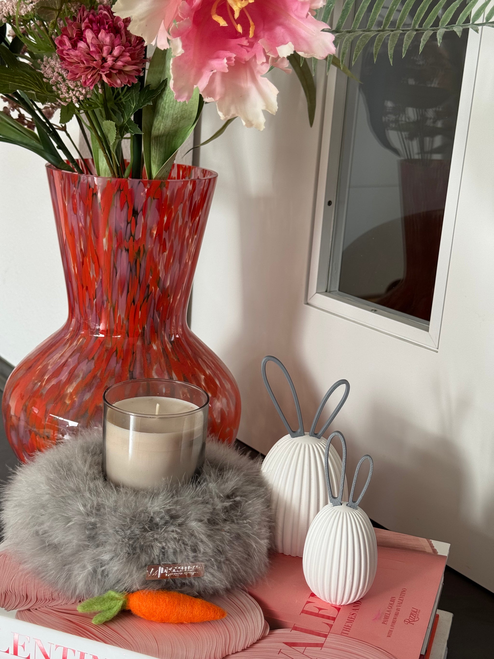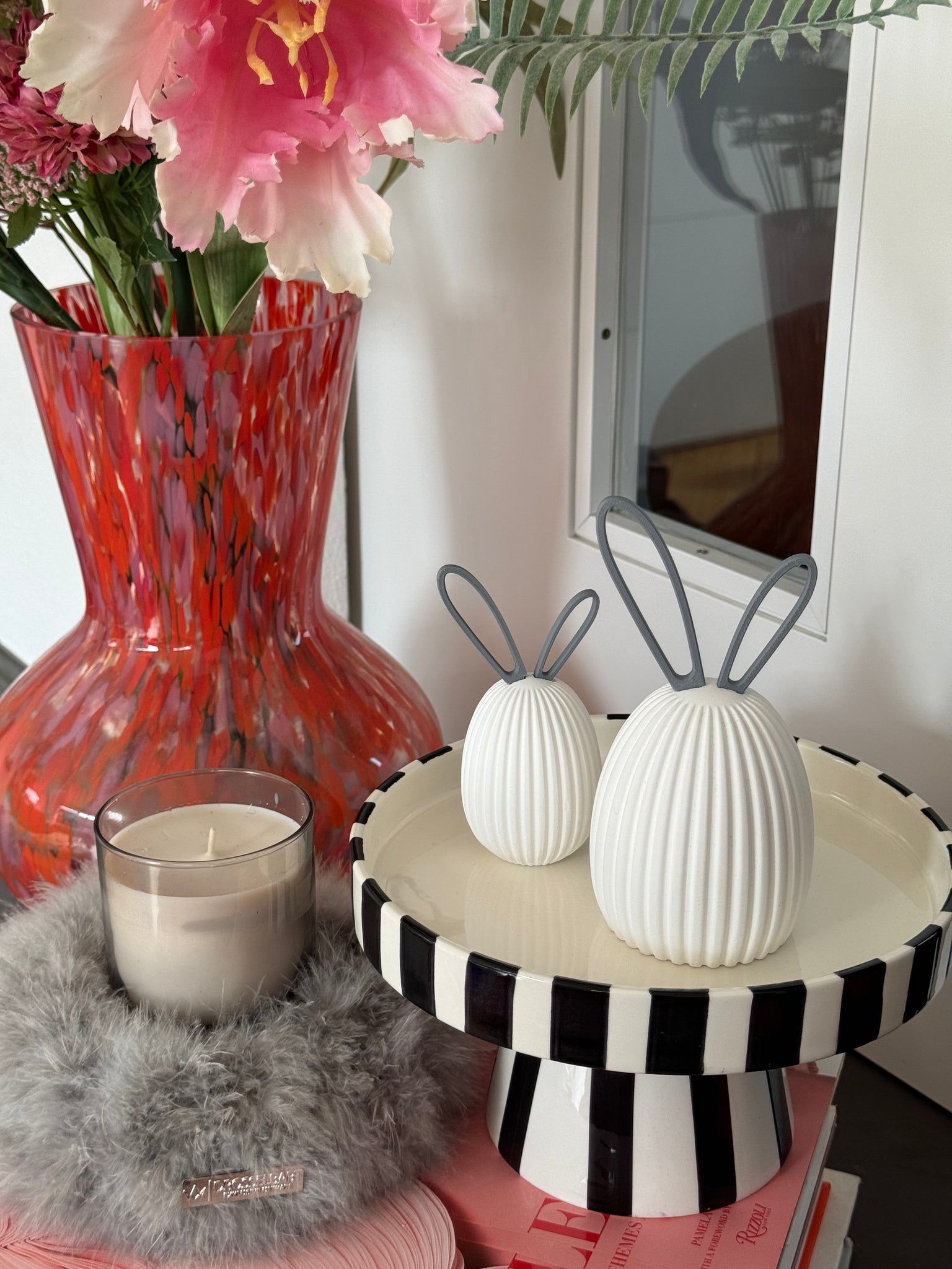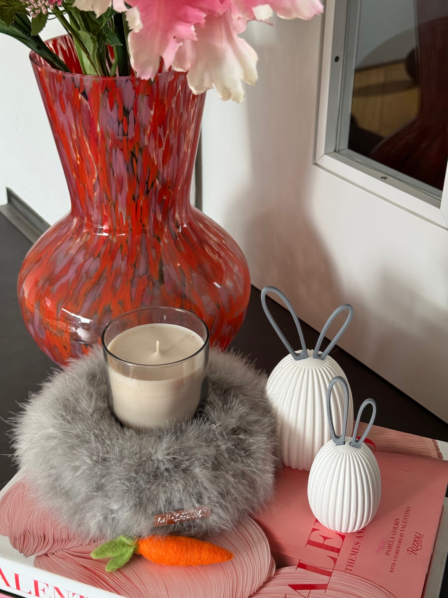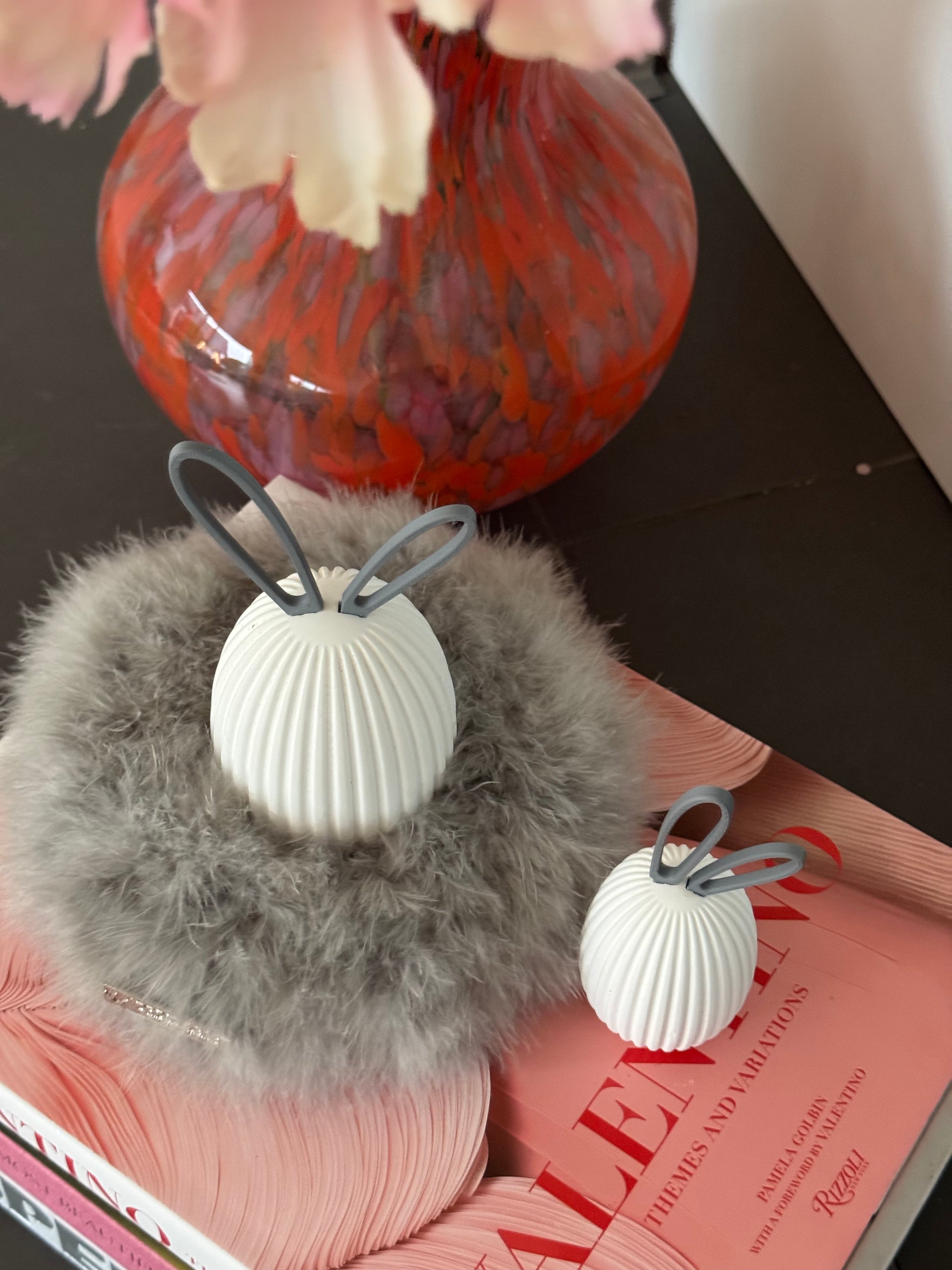 Das Set besteht aus zwei geriffelten Ostereiern aus Keramik in unterschiedlichen Größen, die harmonisch auf einem weichen Marabufederkranz von Drosselbart Design arrangiert sind. Die farblich abgestimmten Ohren werden ganz einfach in die dafür vorgesehene Öffnung gesteckt und sorgen für einen klaren, minimalistischen Look mit humorvollem Detail.