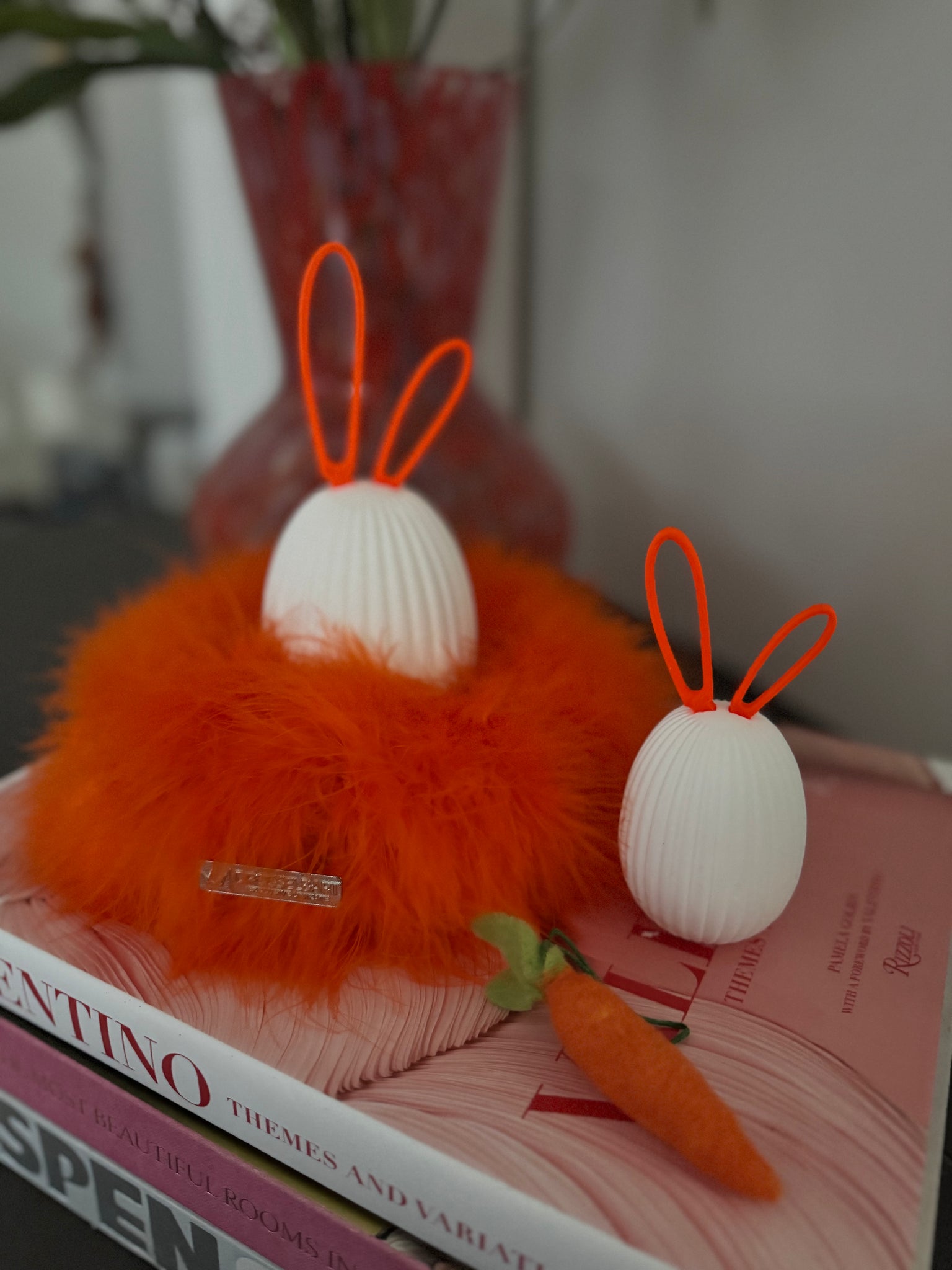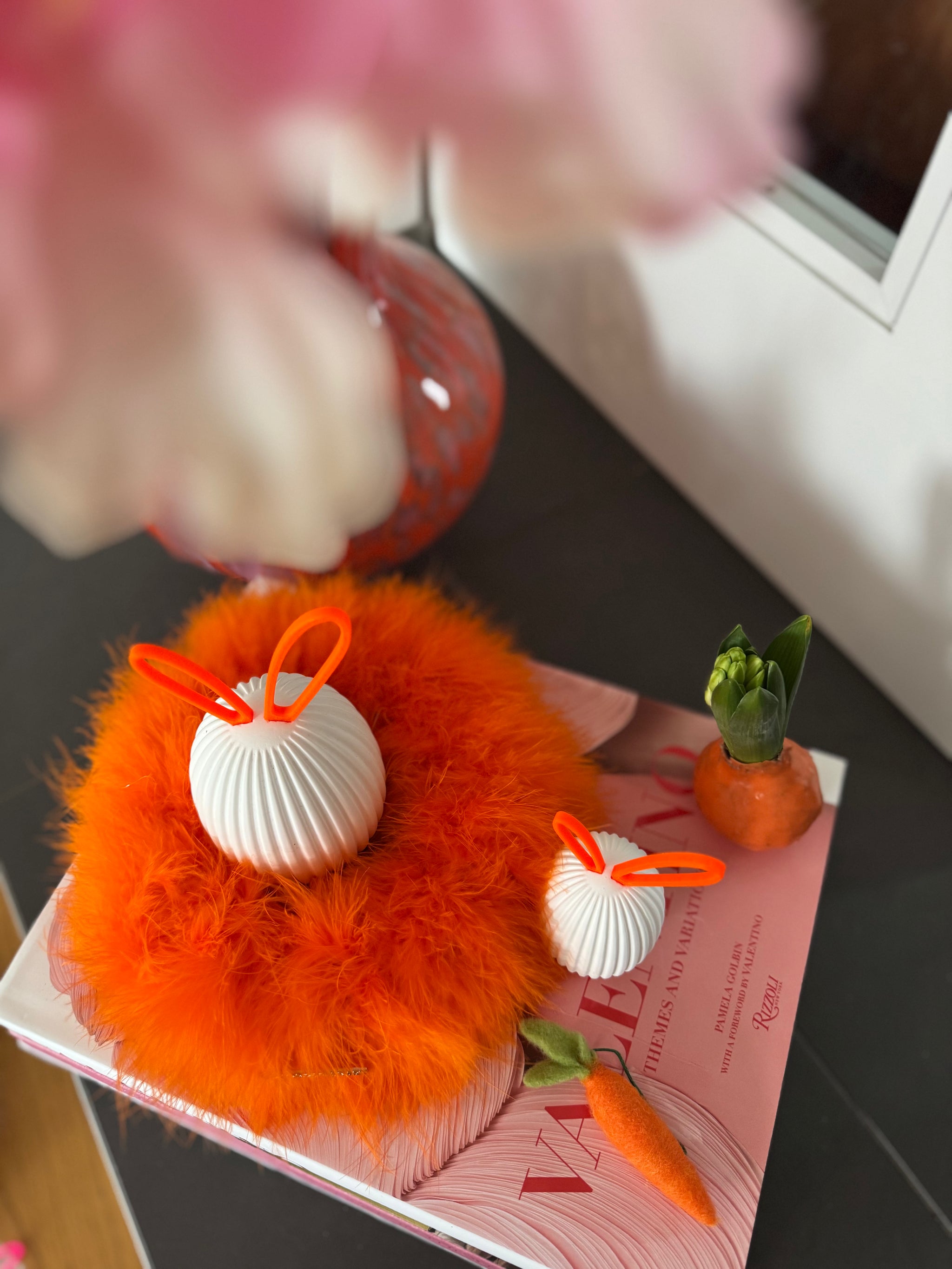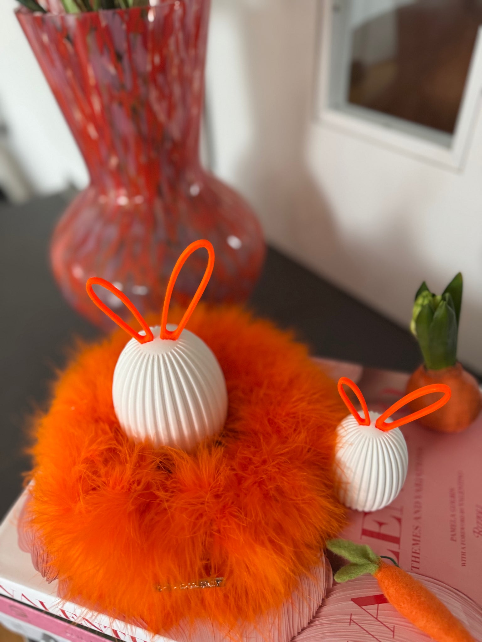 Das Set besteht aus zwei geriffelten Ostereiern aus Keramik in unterschiedlichen Größen, die harmonisch auf einem weichen Marabufederkranz in 15 cm Durchmesser (Farbe: Neonorange) von Drosselbart Design arrangiert sind. Die farblich abgestimmten Ohren werden ganz einfach in die dafür vorgesehene Öffnung gesteckt und sorgen für einen klaren, minimalistischen Look mit humorvollem Detail.