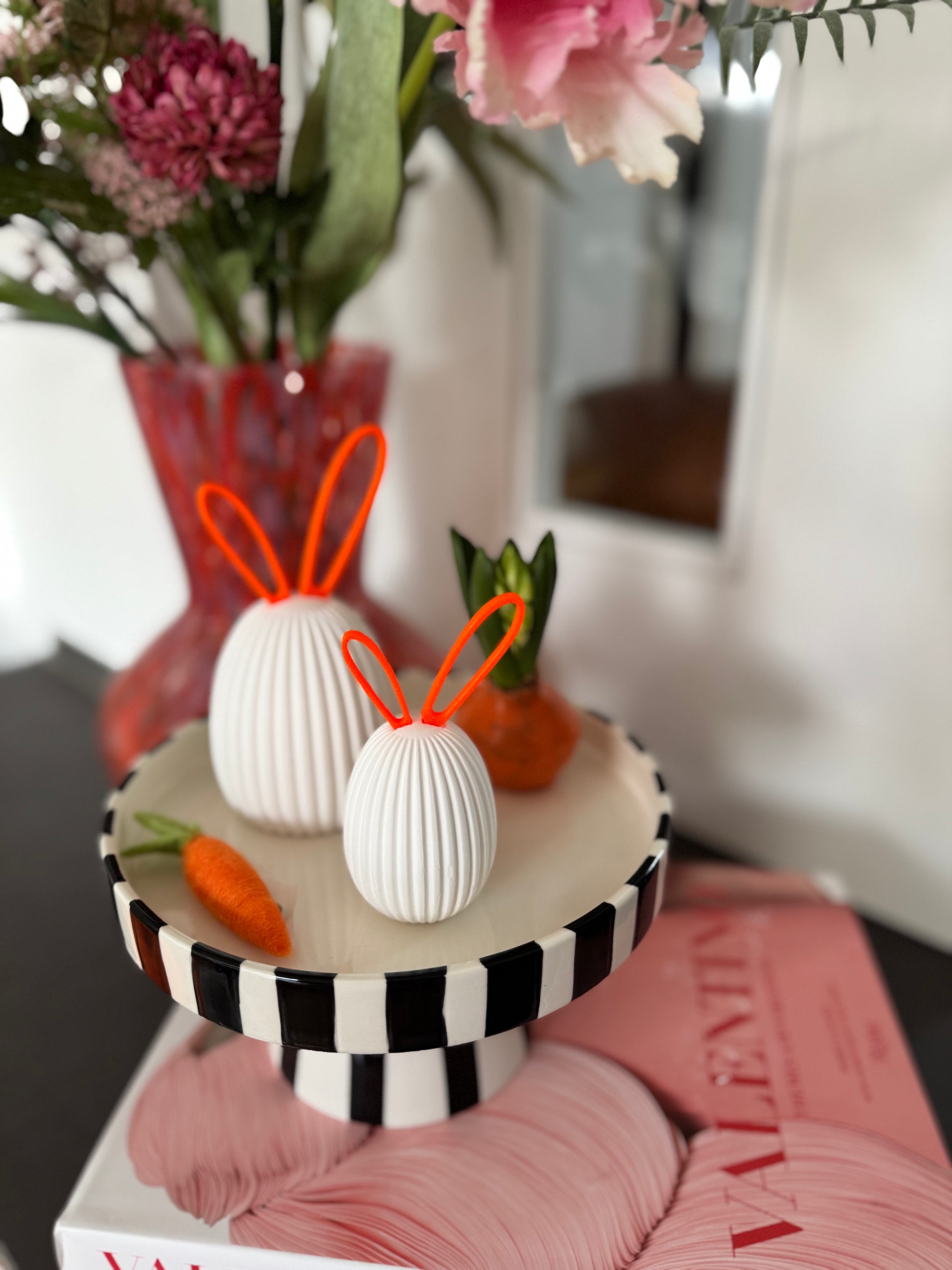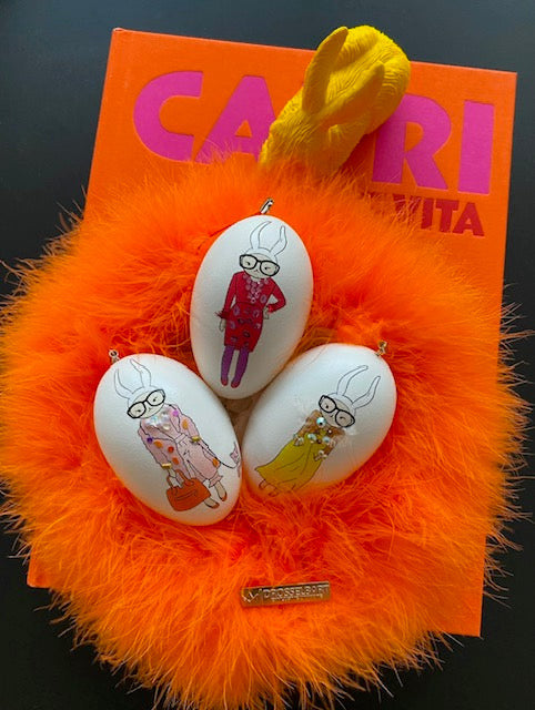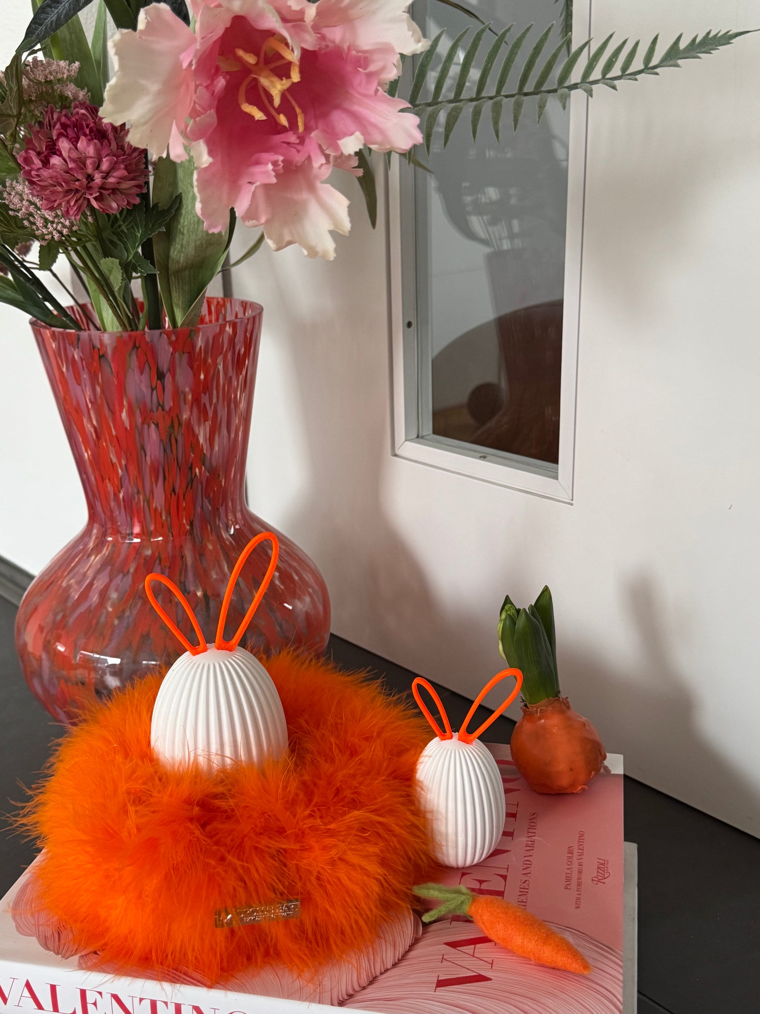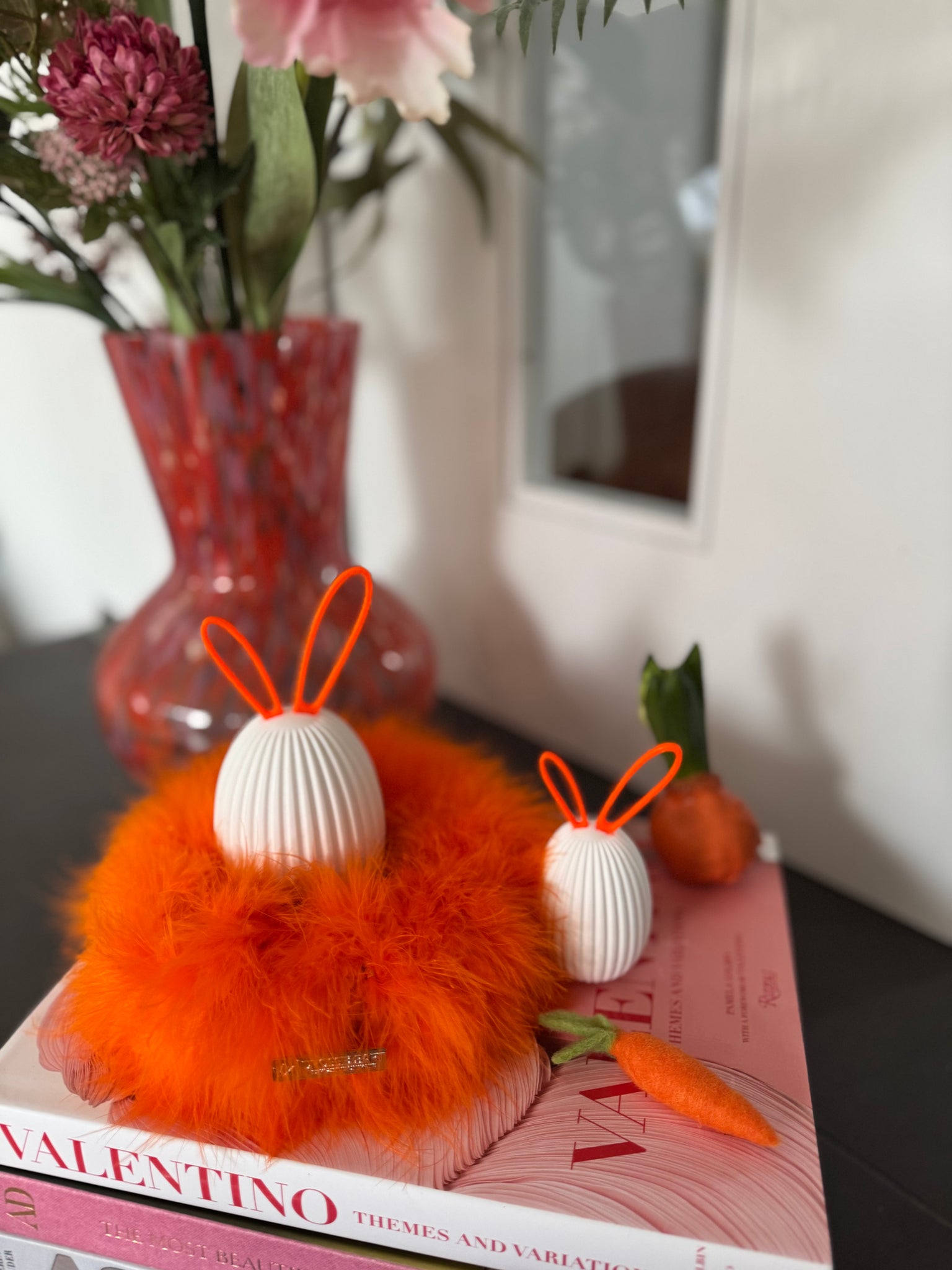 Das Set besteht aus zwei geriffelten Ostereiern aus Keramik in unterschiedlichen Größen, die harmonisch auf einem weichen Marabufederkranz in 15 cm Durchmesser (Farbe: Neonorange) von Drosselbart Design arrangiert sind. Die farblich abgestimmten Ohren werden ganz einfach in die dafür vorgesehene Öffnung gesteckt und sorgen für einen klaren, minimalistischen Look mit humorvollem Detail.