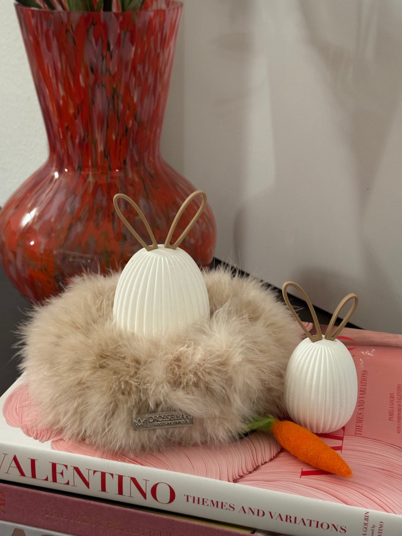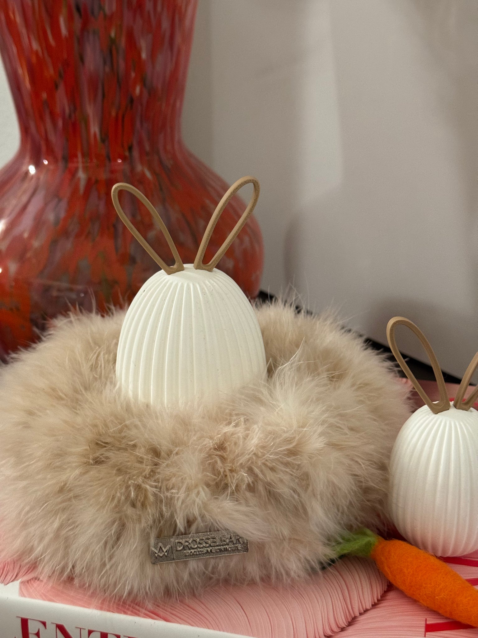 Das Set besteht aus zwei geriffelten Ostereiern aus Keramik in unterschiedlichen Größen, die harmonisch auf einem weichen Marabufederkranz in 15 cm Durchmesser (Farbe: Beige) von Drosselbart Design arrangiert sind. Die farblich abgestimmten Ohren werden ganz einfach in die dafür vorgesehene Öffnung gesteckt und sorgen für einen klaren, minimalistischen Look mit humorvollem Detail.