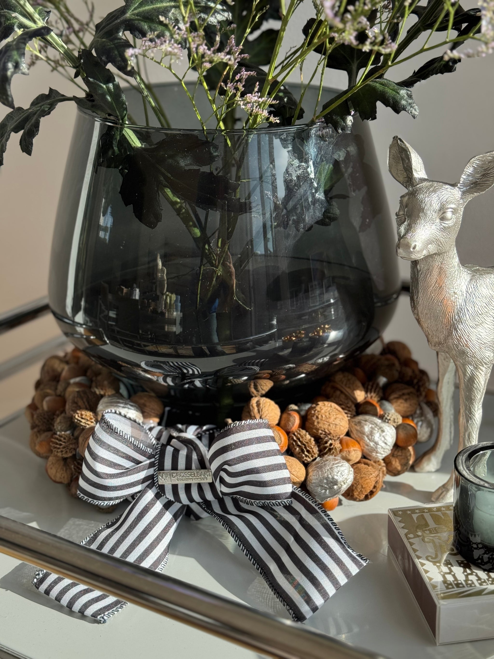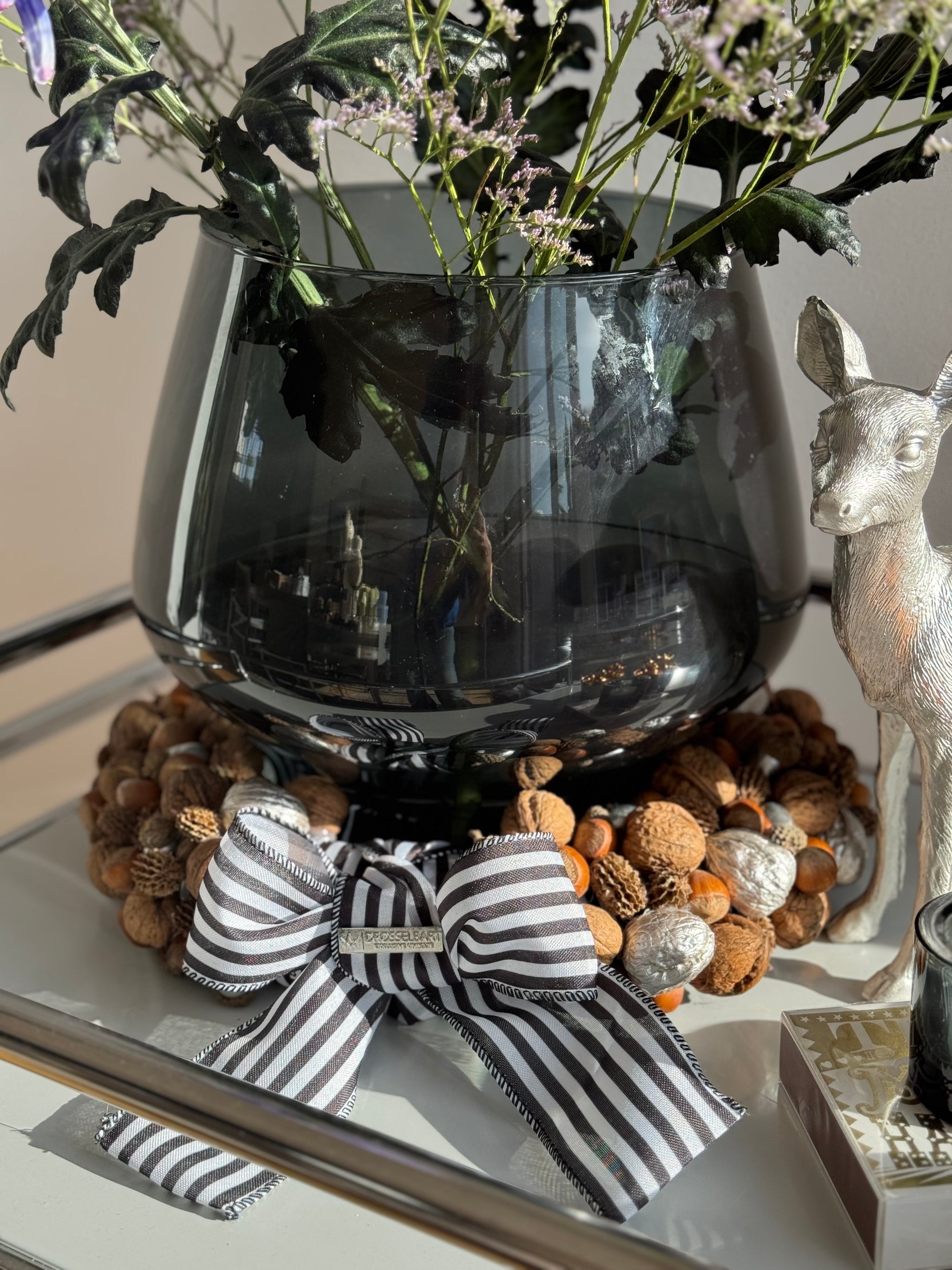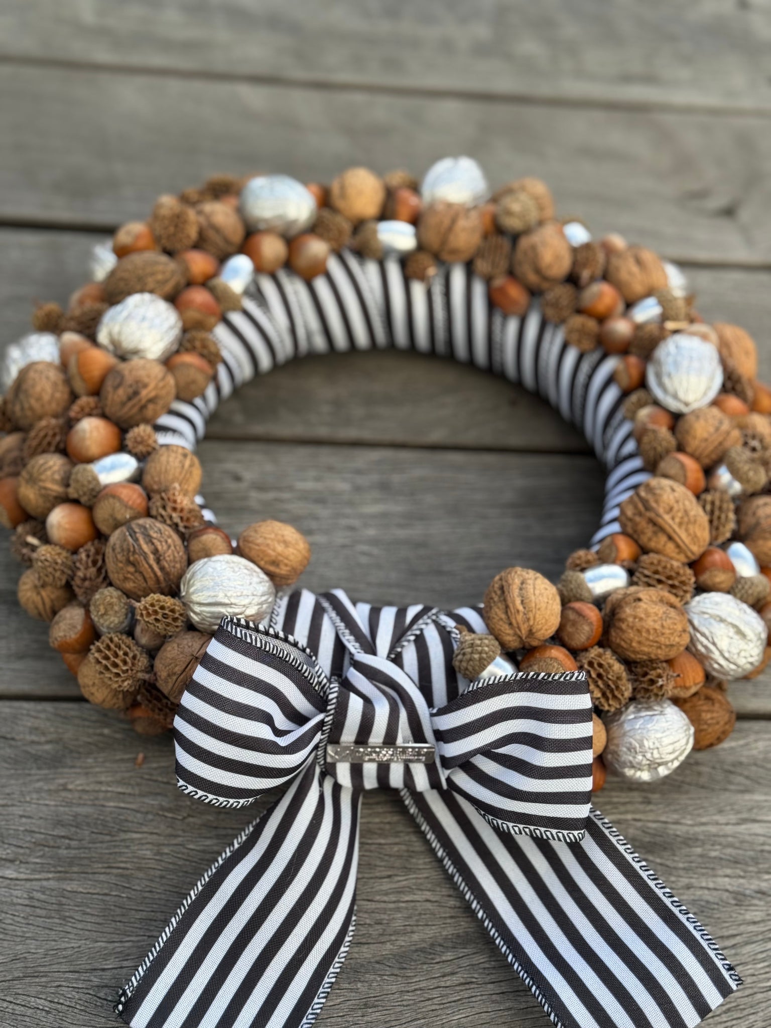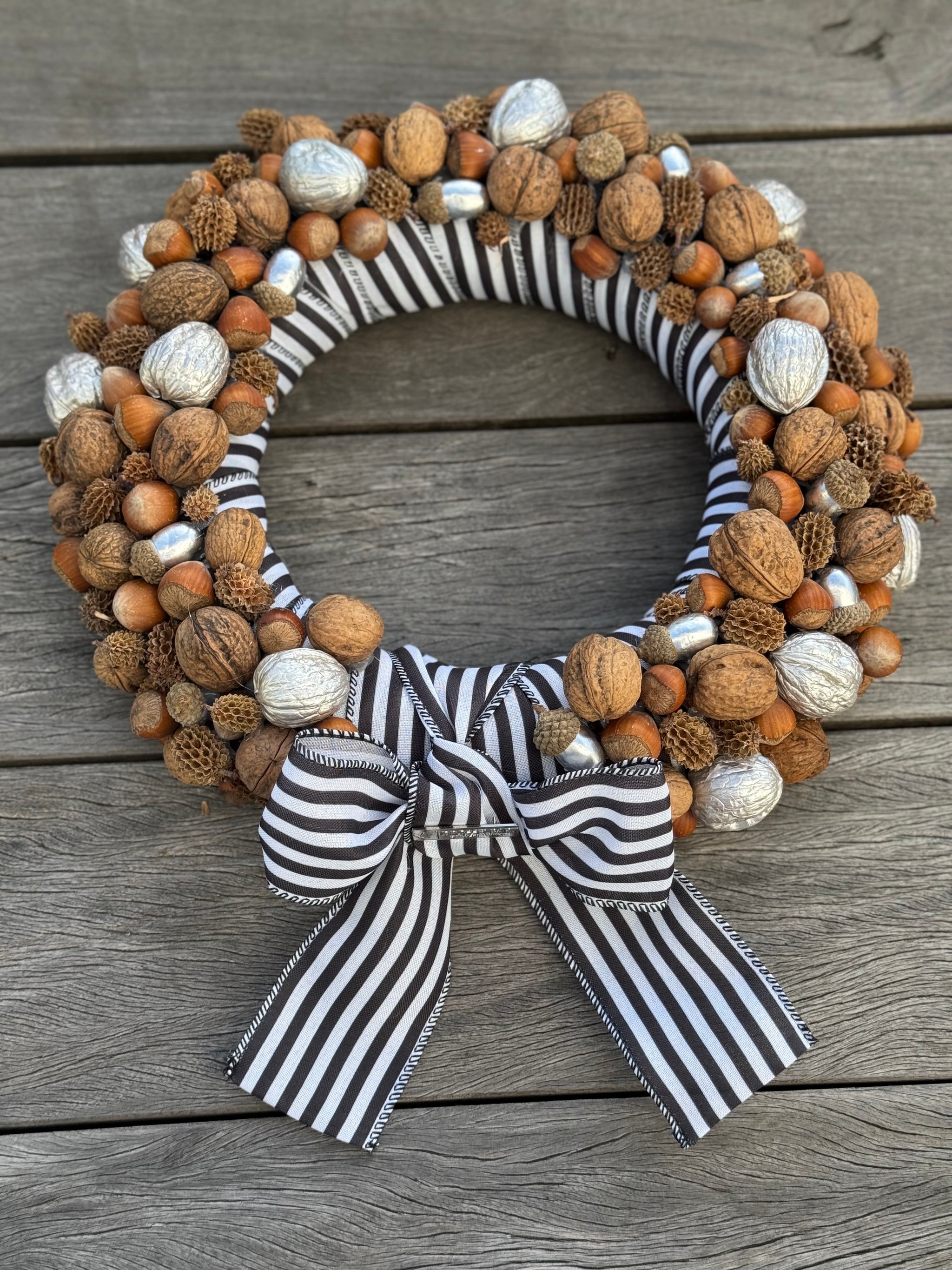 - Kranz im stilvollen Schwarz-Weiß-Streifenmuster und Schleife (wie abgebildet) und jeder Menge Nüsse in Natur und Silber nur von der oberen Seite und nicht komplett mit Nüssen dekoriert - siehe Bilder