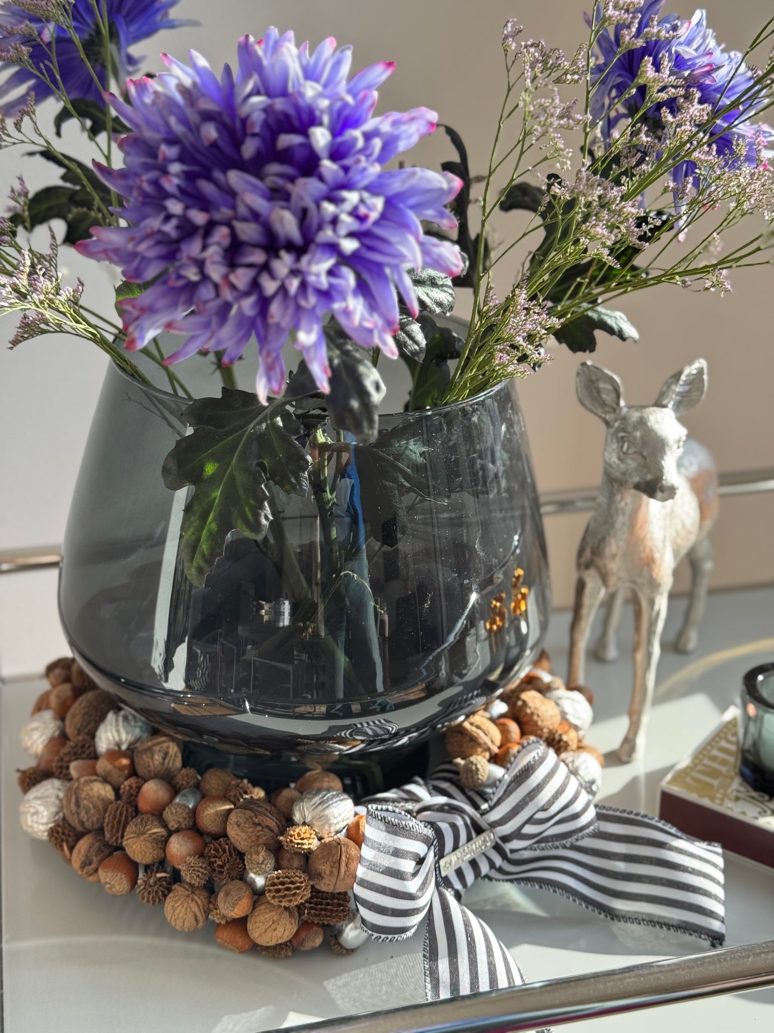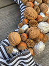 Weniger ist mehr – und genau darin liegt der Zauber dieses außergewöhnlichen Kranzes. Gefertigt aus gestreiftem Stoff und edlen Nüssen, wird die kuschelige Jahreszeit zu einer stilvollen Wohlfühloase.