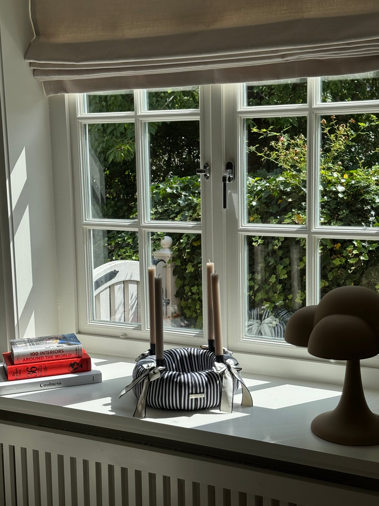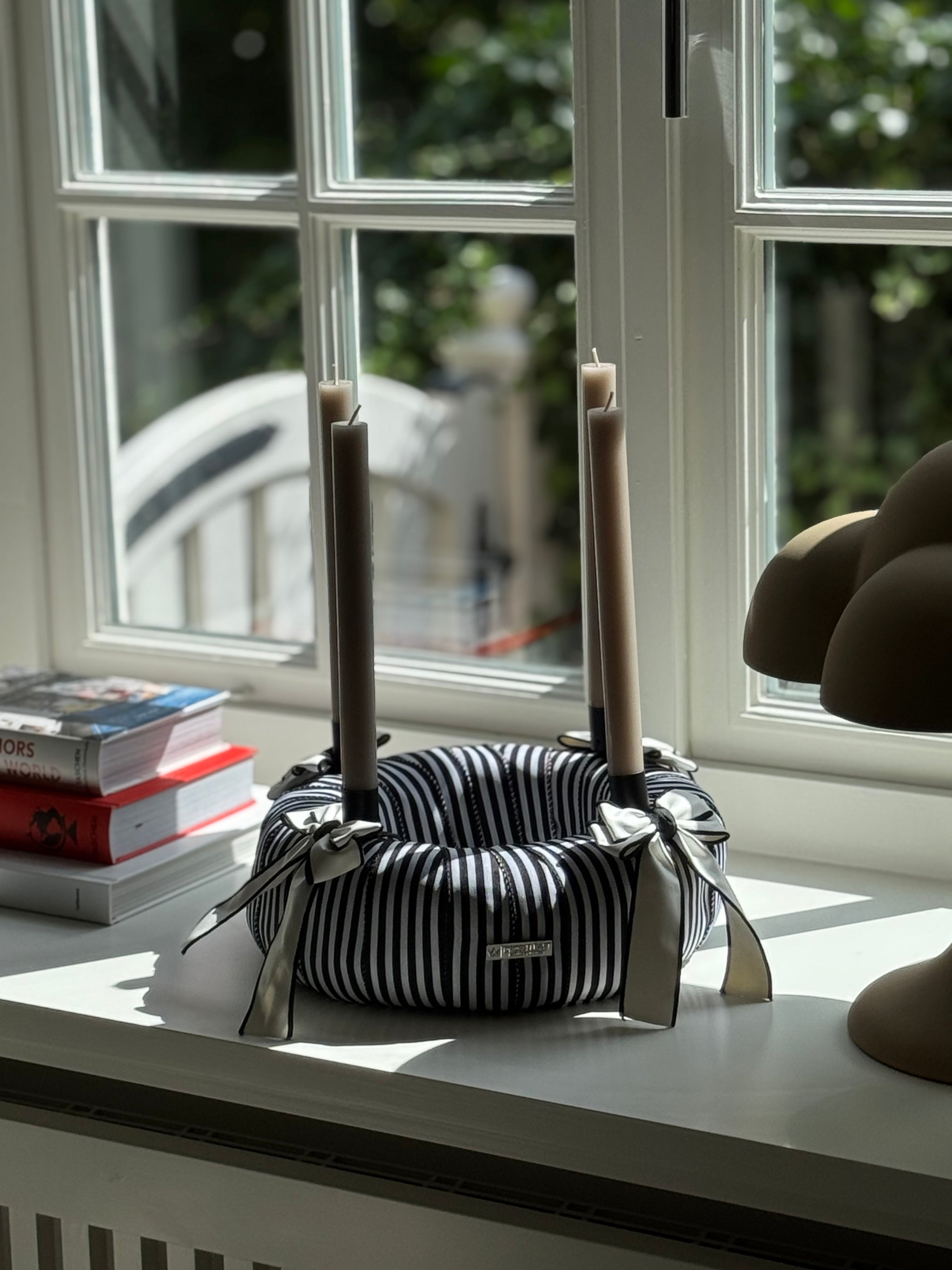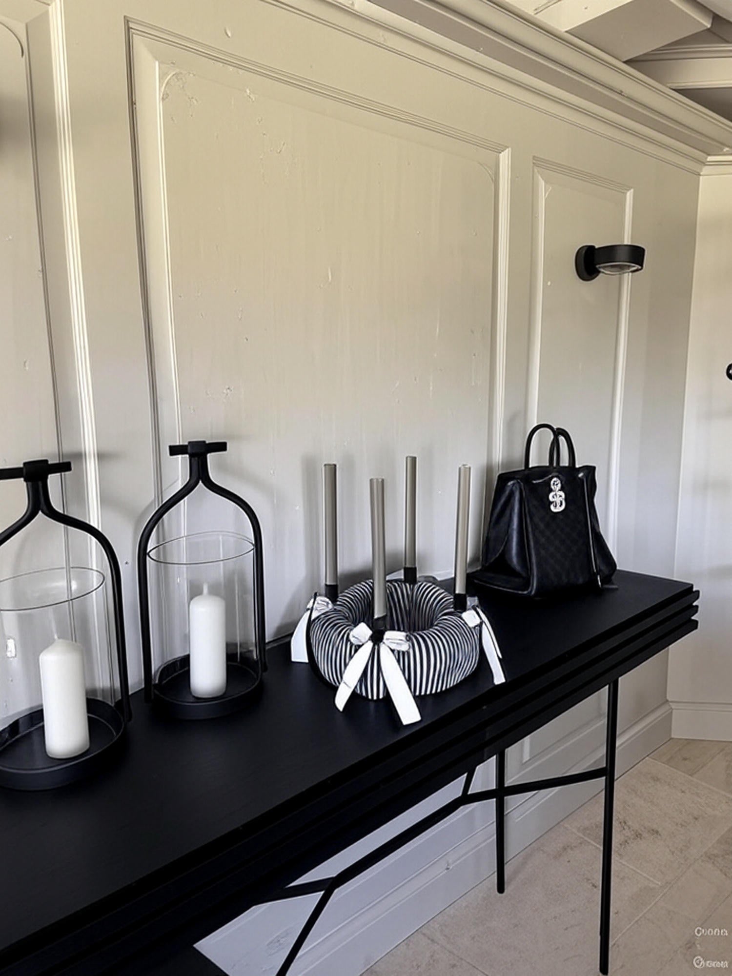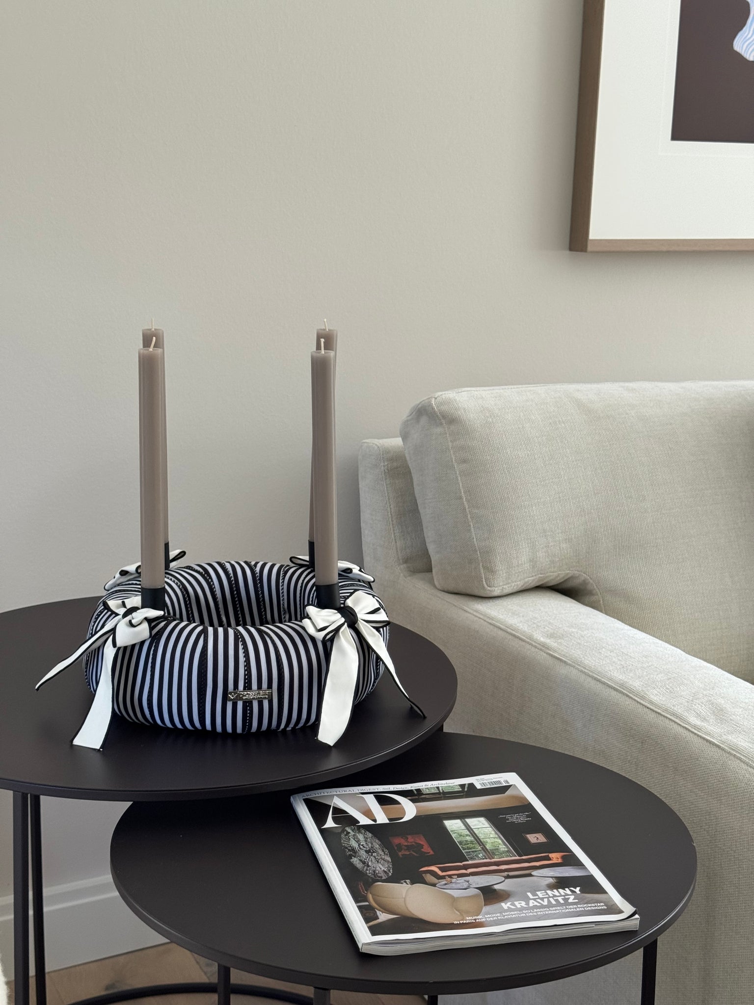 Die klare Formensprache, das edle Streifenmuster und die dunklen Kerzen schaffen eine puristische Ästhetik, die durch ihre schlichte Schönheit besticht – ein echtes Statement-Piece à la Chanel.