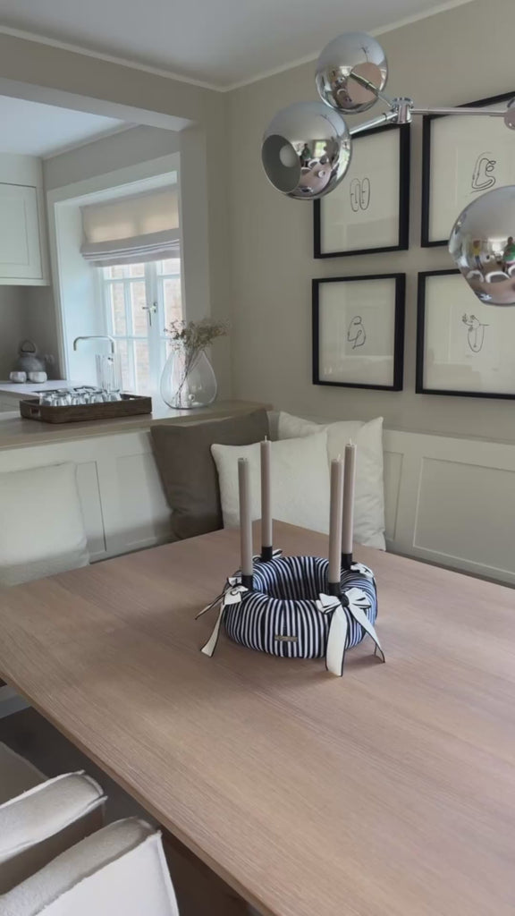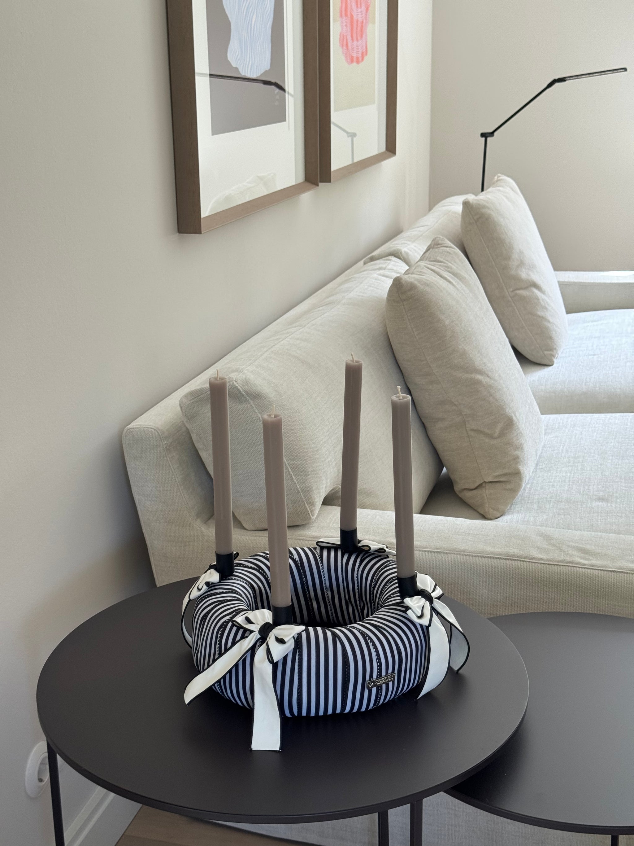 Adventskranz Coco schlichte, zeitlose Eleganz in schwarz / weiß gestreift aus Stoff+ Schleifen mit Stabkerzen von Engels Kerzen taupe Gr. M