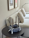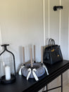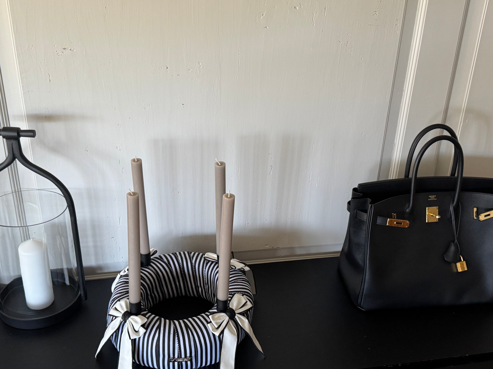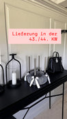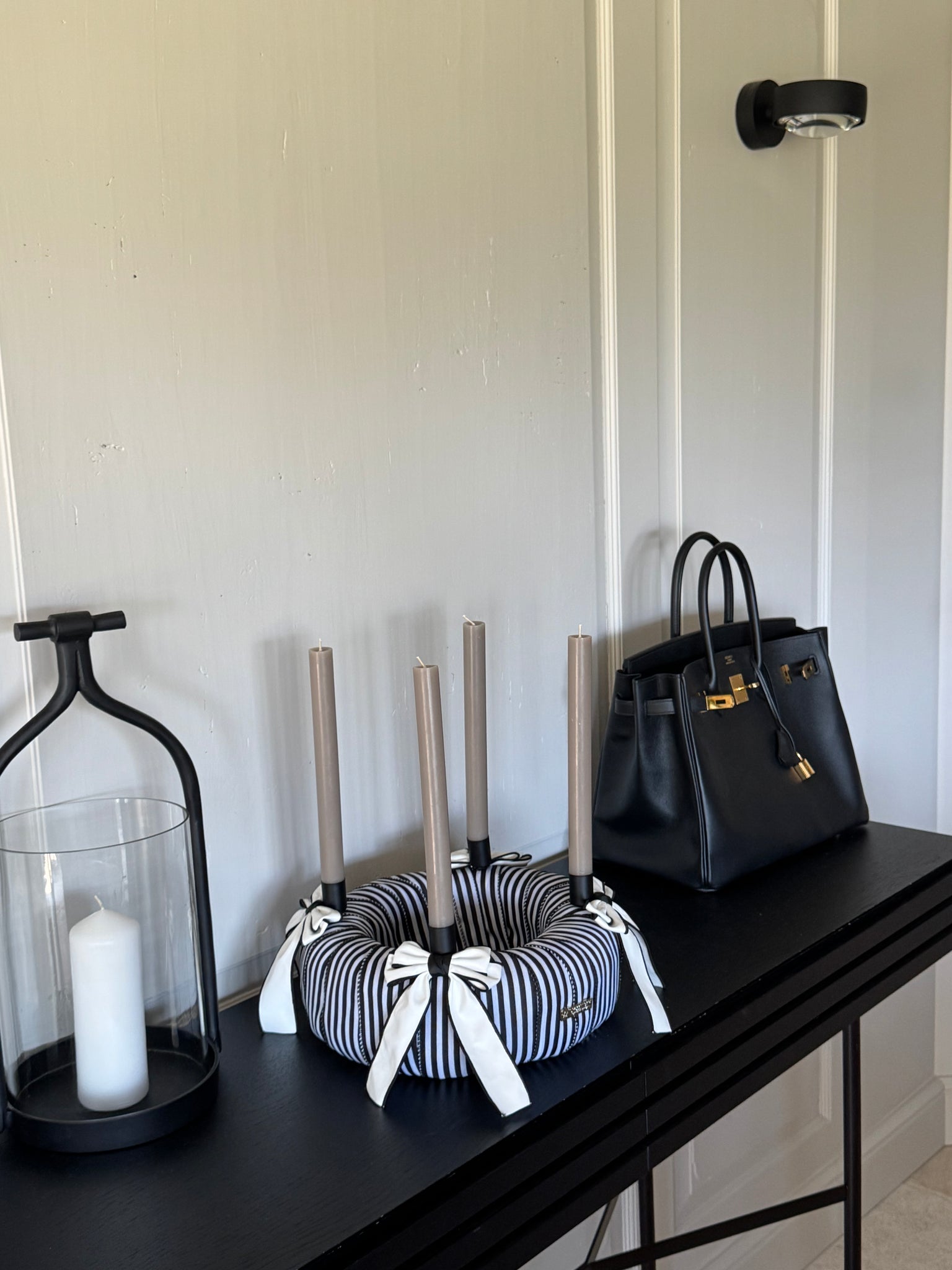 Die klare Formensprache, das edle Streifenmuster und die dunklen Kerzen schaffen eine puristische Ästhetik, die durch ihre schlichte Schönheit besticht – ein echtes Statement-Piece à la Chanel.