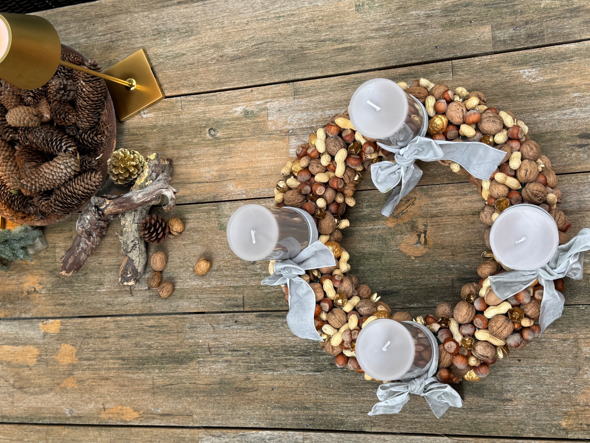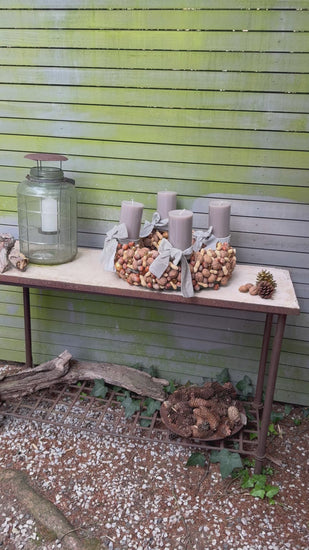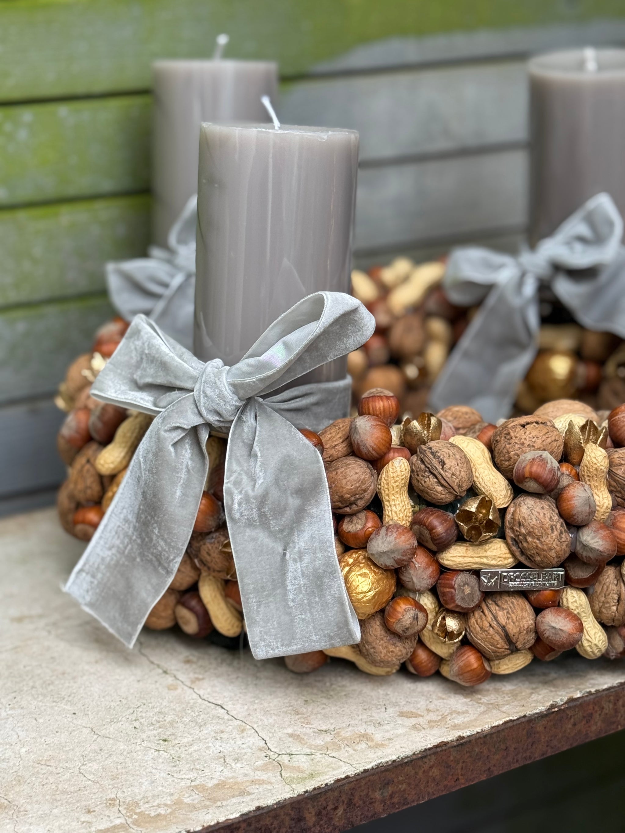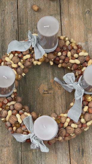 Da wird die Vorweihnachtszeit zur kleinen Märchenstunde. Ein echtes Statement-Piece sorgfältig von Hand gefertigt, vereint er echte Hasel; Wal; und Erdnüsse mit goldenen Akzenten zu einem kunstvollen Kranz - wie aus dem Zauberwald ! Die edlen Samtschleifen in grau/taupe und die durchgefärbten, stilvollen Stumpenkerzen verleihen dem Kranz einen Märchenhaften Zauber.