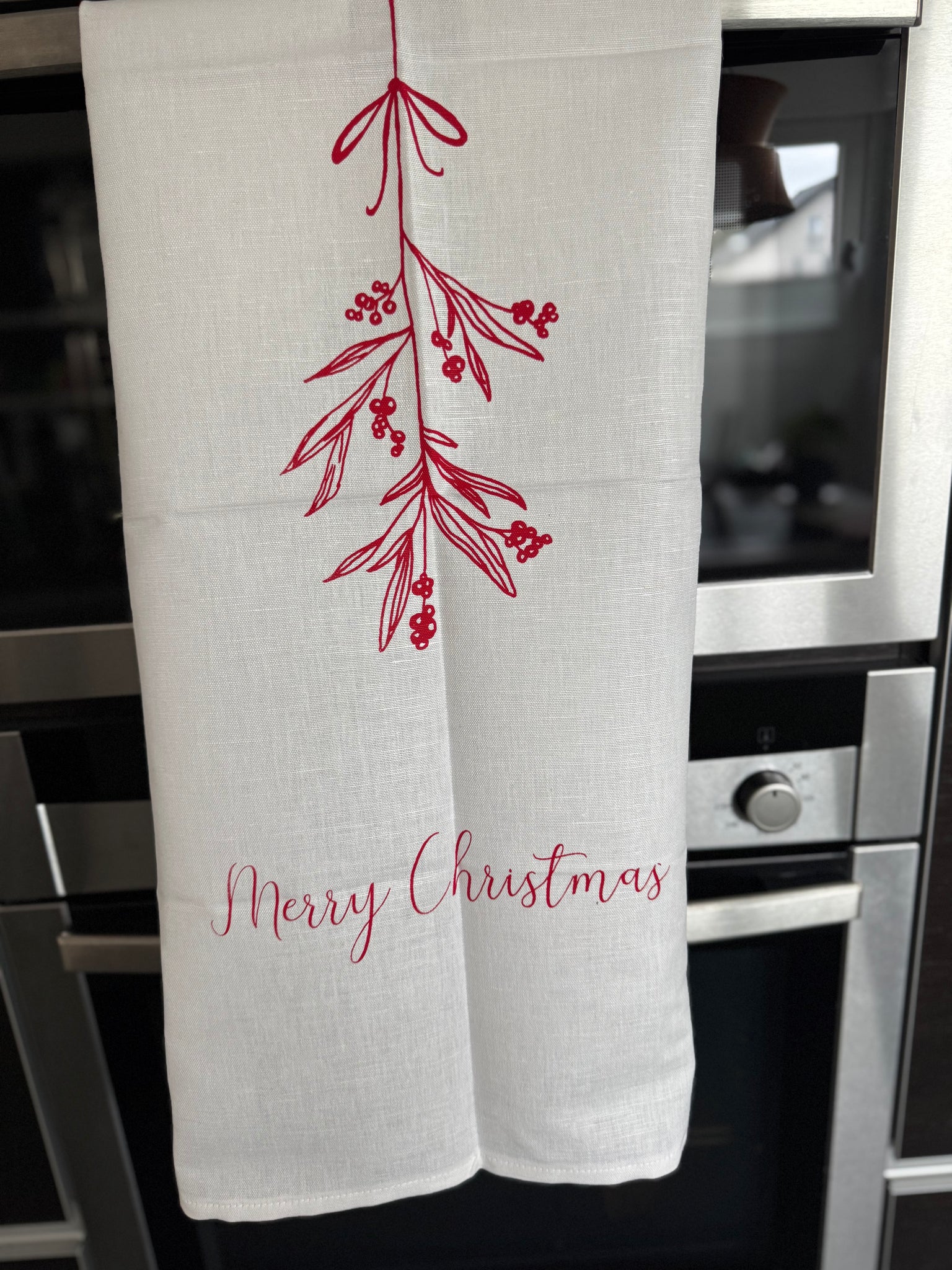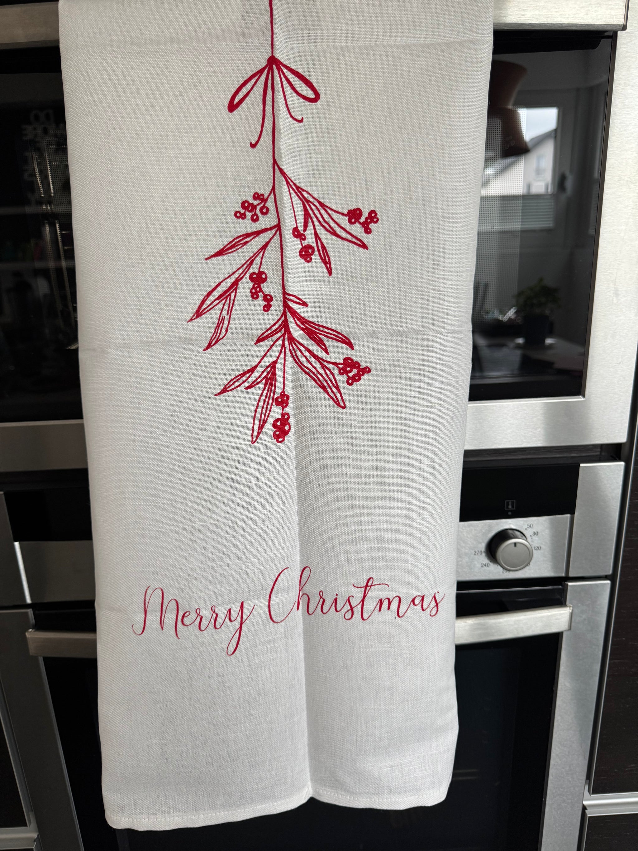 Geschirrtuch „ Merry CHRISTMAS " Mistelzweig weiss/ rot Siebdruckkunst M. Tenbergen
