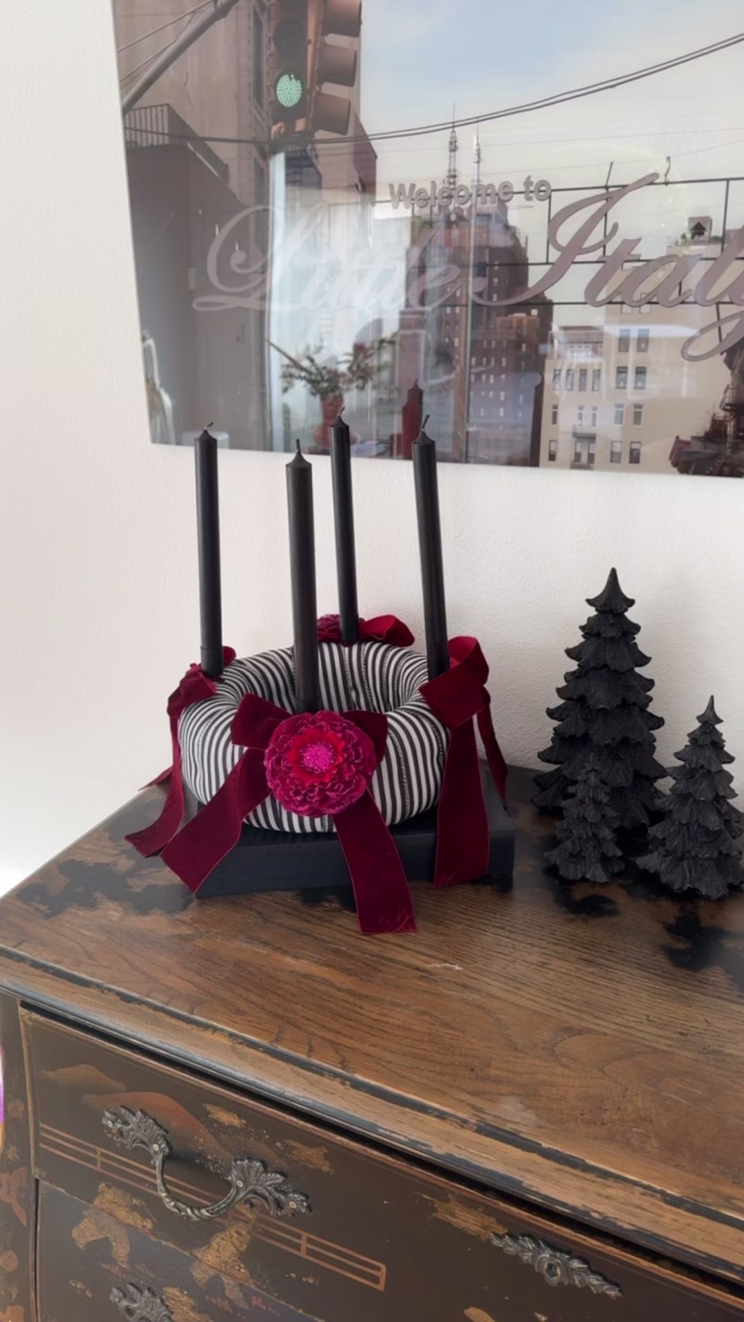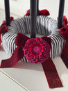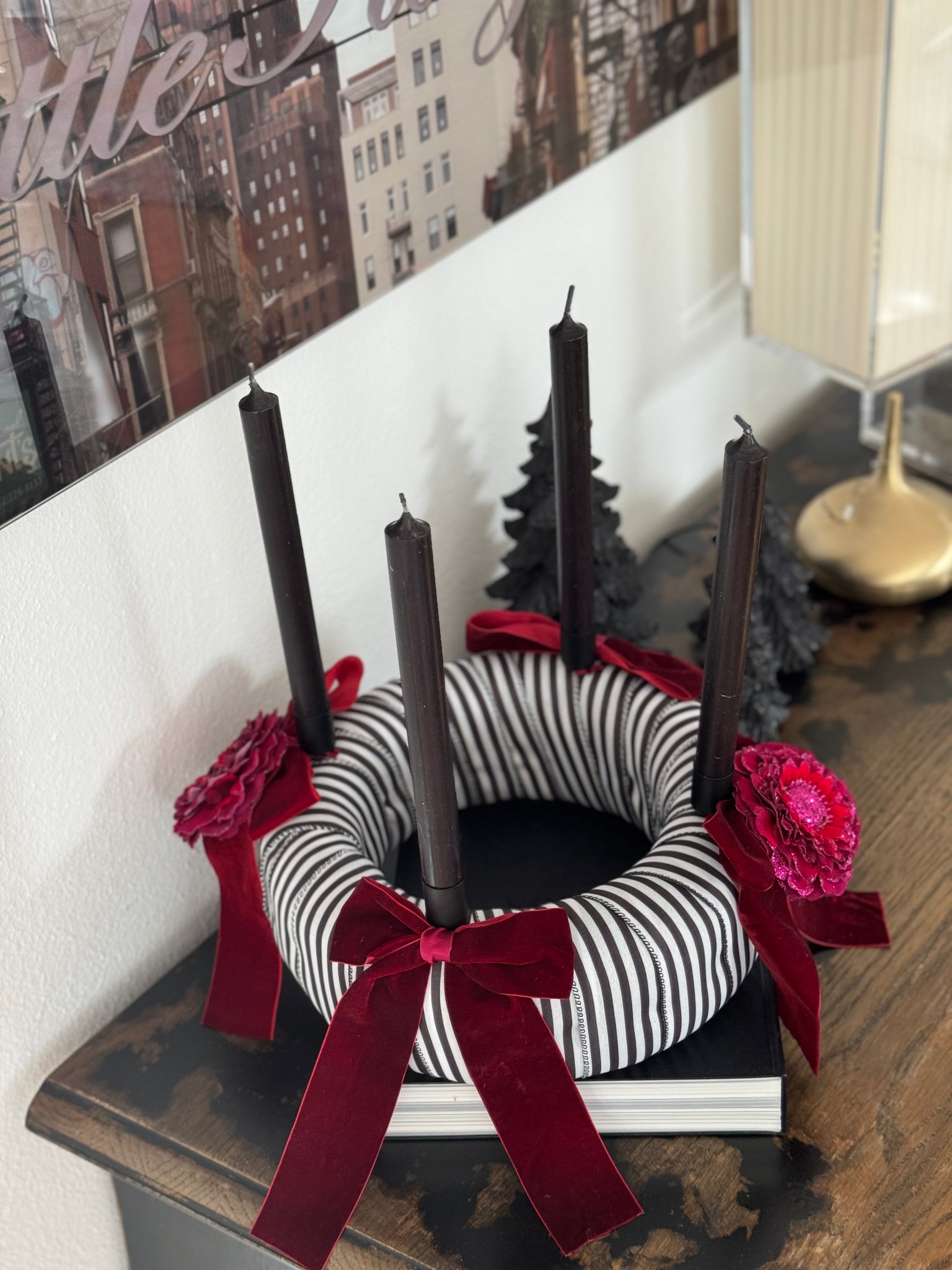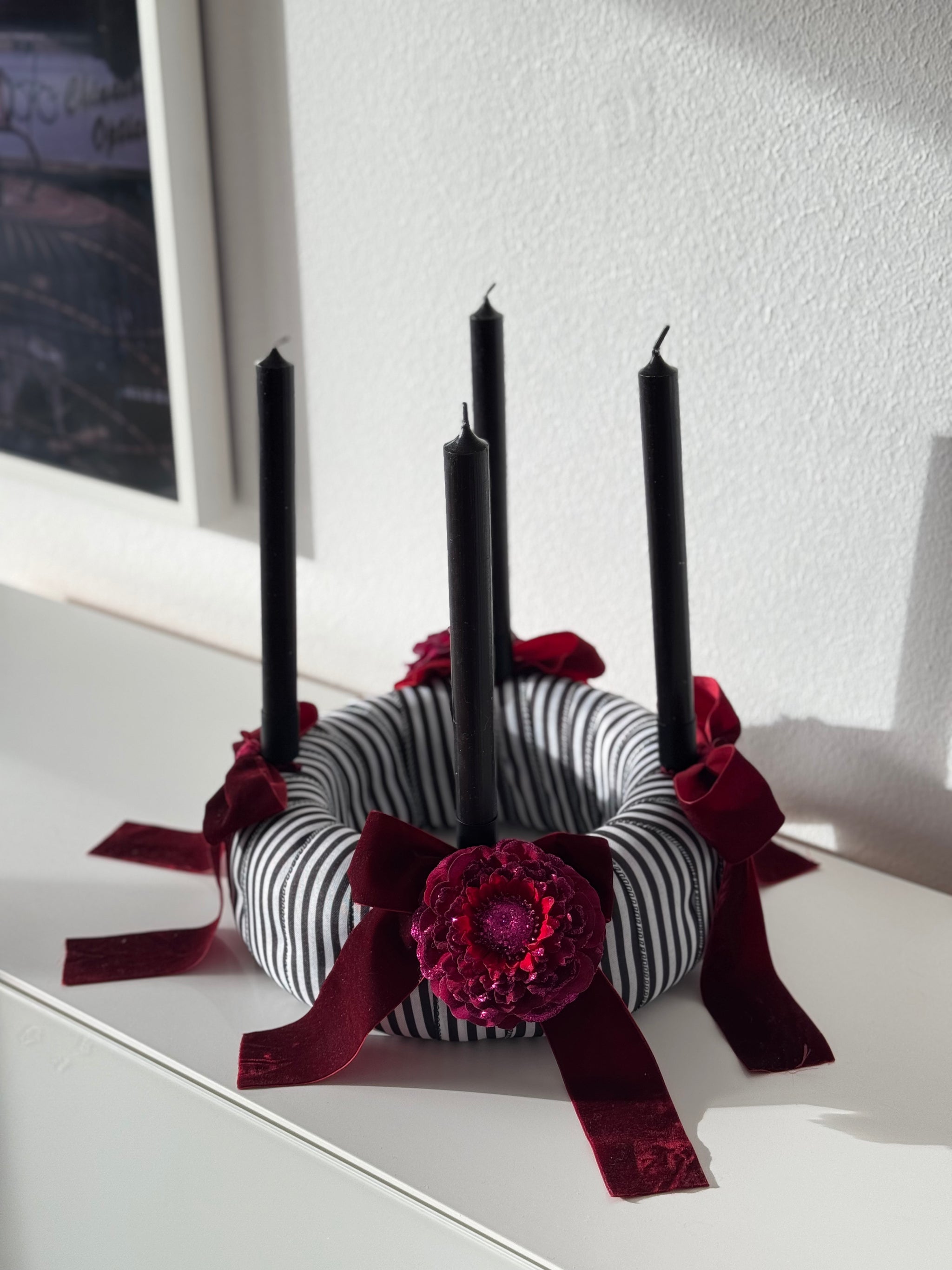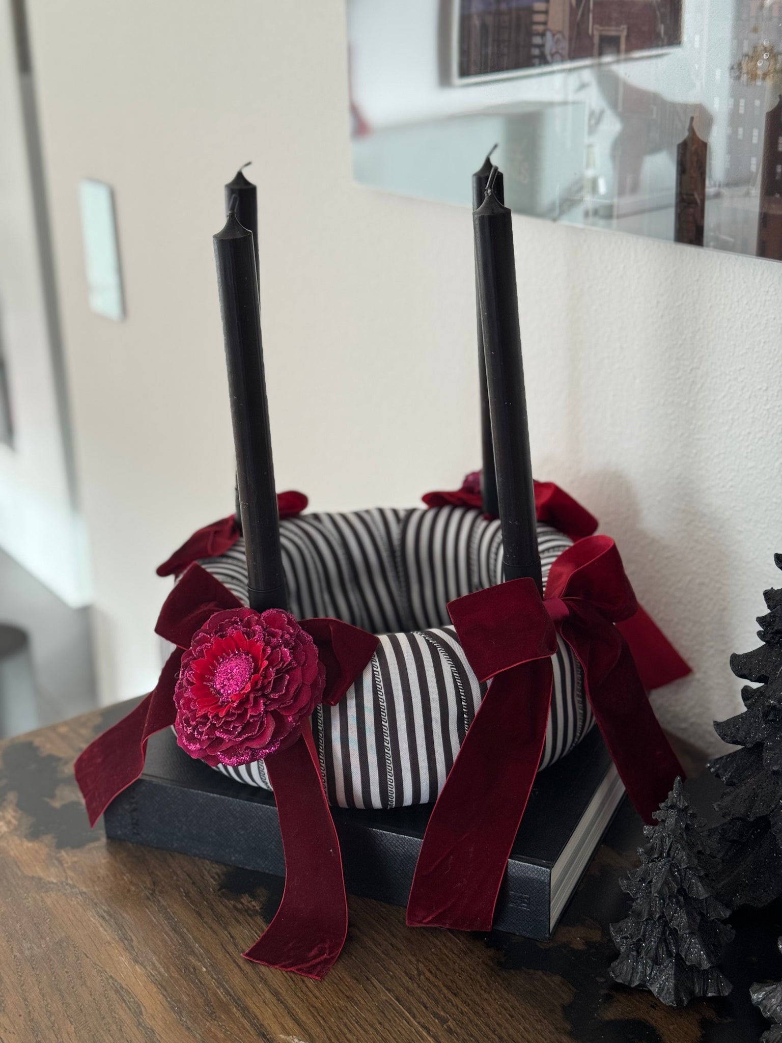 - Ein Adventskranz im stilvollen Schwarz-Weiß-Streifenmuster (wie abgebildet) und 4 Schleifen in dunkelrotem Samtstoff mit 2 Blüten in der Farbe pink / dunkelrot und Glitzer - siehe Bilder