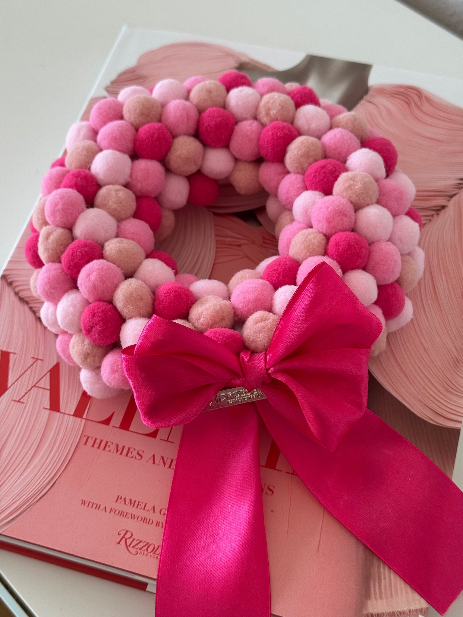 Mein handgefertigter Pompon-Kranz in zarten Rosa-, Pink- und Hot-Pink-Tönen ist wie ein flauschiger Pink-Cloud, der einfach überall hinpasst.