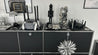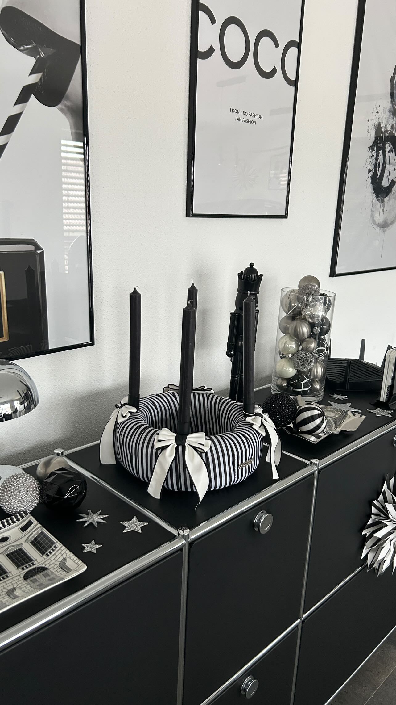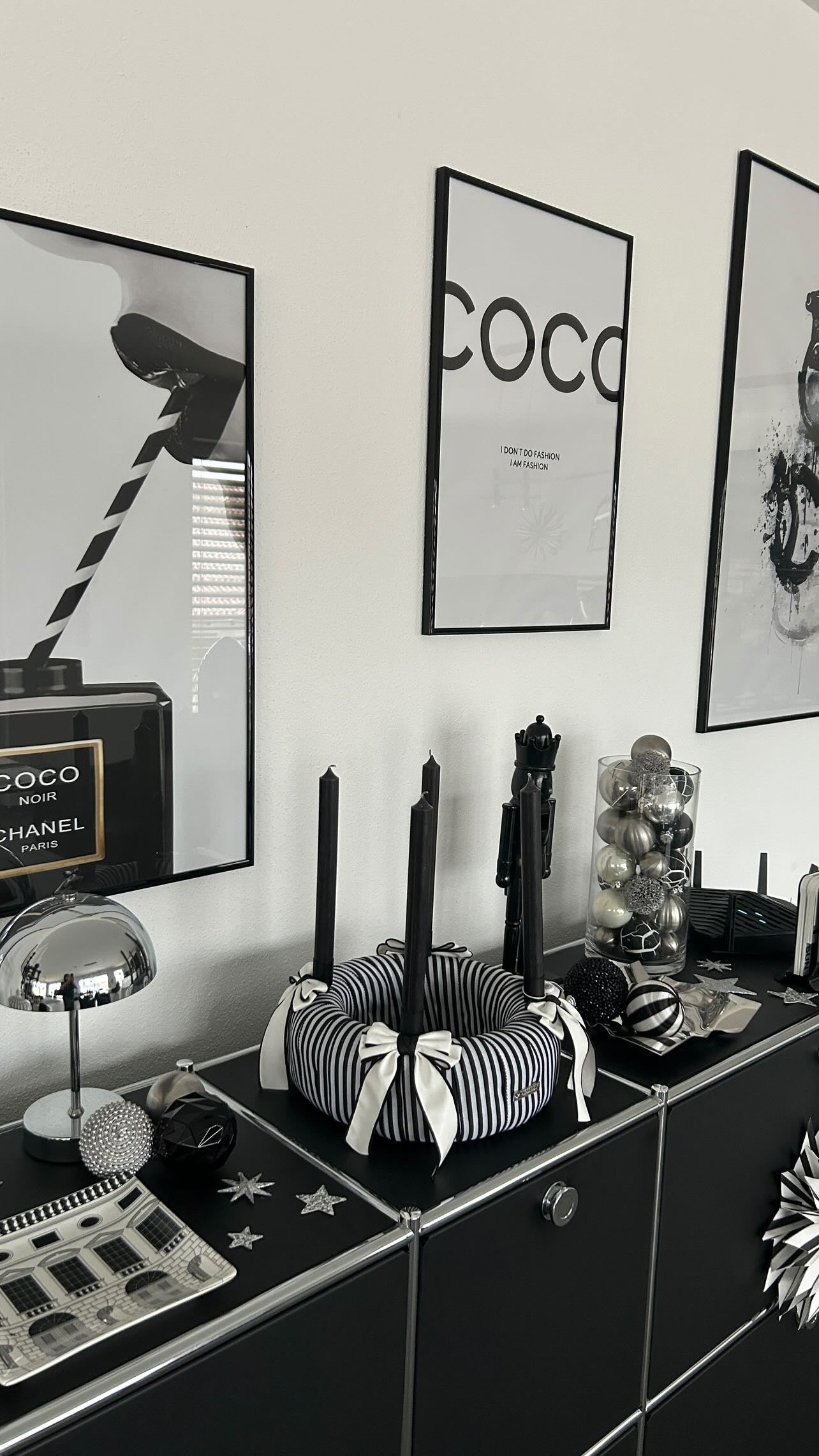 Die klare Formensprache, das edle Streifenmuster und die dunklen Kerzen schaffen eine puristische Ästhetik, die durch ihre schlichte Schönheit besticht – ein echtes Statement-Piece à la Chanel.