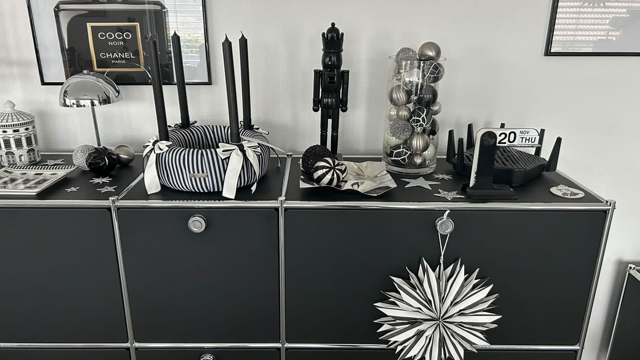 Weniger ist mehr – und genau darin liegt der Zauber dieses besonderen Adventskranzes, der an Chanels ikonischen Schwarz-Weiß-Look erinnert.